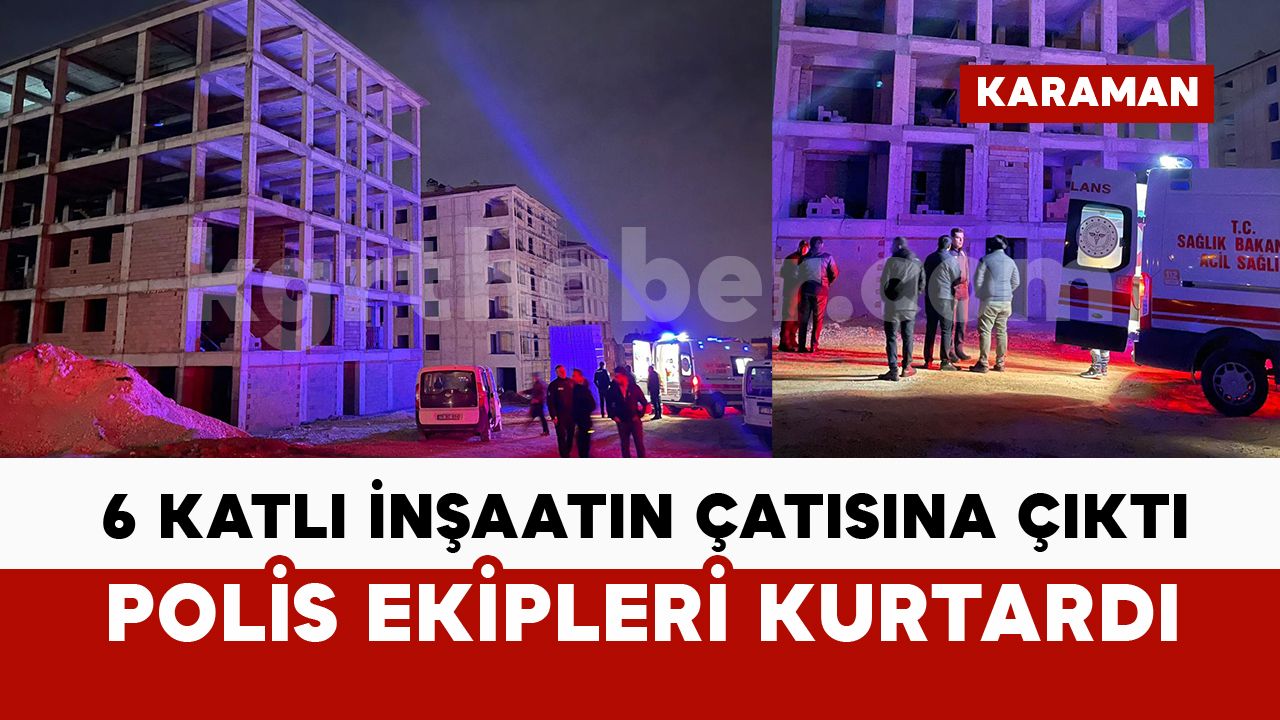 Olay, gece saat 23.30 sıralarında Hürriyet Mahallesi Şehit Fethi Sekin Bulvarı yakınlarında bulunan 6 katlı apartman inşaatının çatısında yaşandı. Edinilen bilgiye göre, çatıya çıkan şahsı gören vatandaşlar durumu 112 Acil Çağrı Merkezi’ne bildirdi. İhbar üzerine adrese sağlık, itfaiye ve polis ekipleri sevk edildi. Çatıya hayatına son vermek için çıktığı öğrenilen şahsı polis ekipleri ikna etmeye çalışırken, itfaiye ekipleri ise branda açtı. Bir süre sonra şahıs polisin ikna çalışmaları sonucu çıktığı çatıdan aşağıya indirilerek ambulansla tedbir amacıyla Karaman Eğitim ve Araştırma Hastanesi’ne kaldırıldı. Olayla ilgili tahkikat başlatıldı.