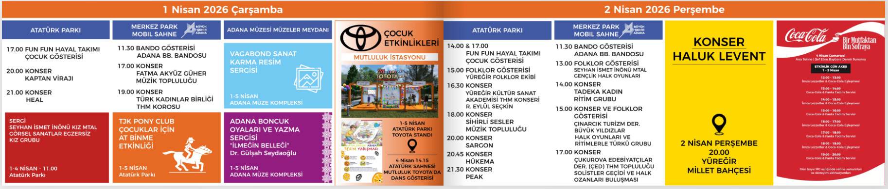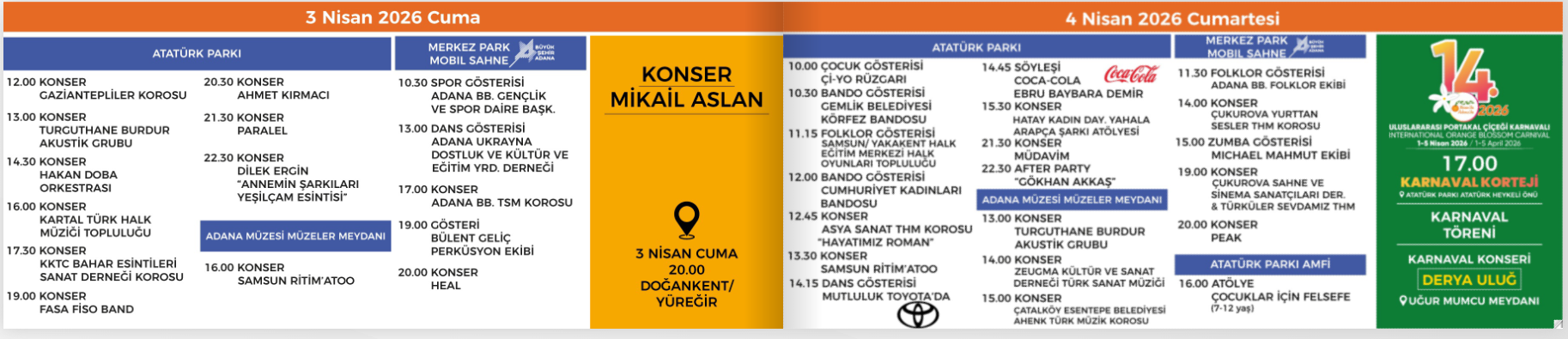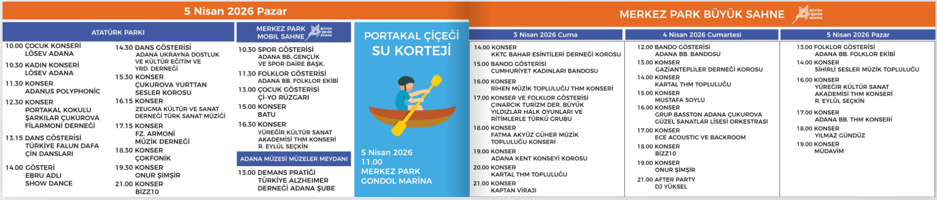 2026 Portakal Çiçeği Festivali kapsamında sahne alacak sanatçılar da açıklandı. 2 Nisan’da Haluk Levent, Yüreğir Millet Bahçesi’nde konser verecek. 3 Nisan’da Mikail Aslan Doğankent Yüreğir’de sahne alacak. Festivalin dikkat çeken isimlerinden Derya Uluğ ise 4 Nisan’da müzikseverlerle buluşacak.
