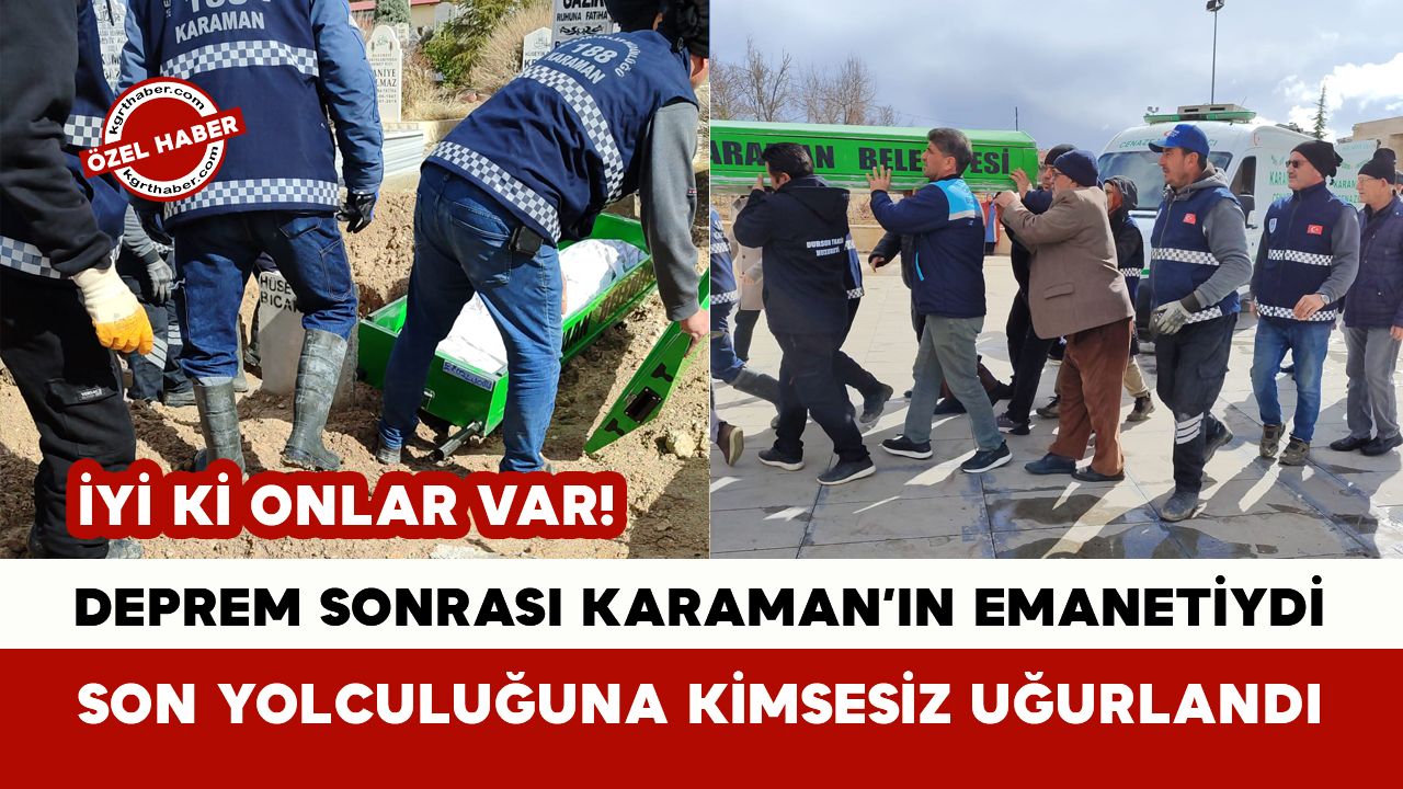 Deprem felaketi sonrası Karaman’a sığınan ve huzurevinde hayatını kaybeden Elif Kozluoğlu’nun cenazesinin kimsesiz kalması, cenazeye katılanlara duygusal anlar yaşatırken; Karaman Belediyesi Mezarlıklar Müdürlüğü ekiplerinin oluşturduğu cemaatle son yolculuğuna uğurlandı. Kimsesizlerin kimsesi olan belediye personeli, Elif teyzenin tabutunu omuzlayarak defin işlemlerini dualar eşliğinde gerçekleştirdi.