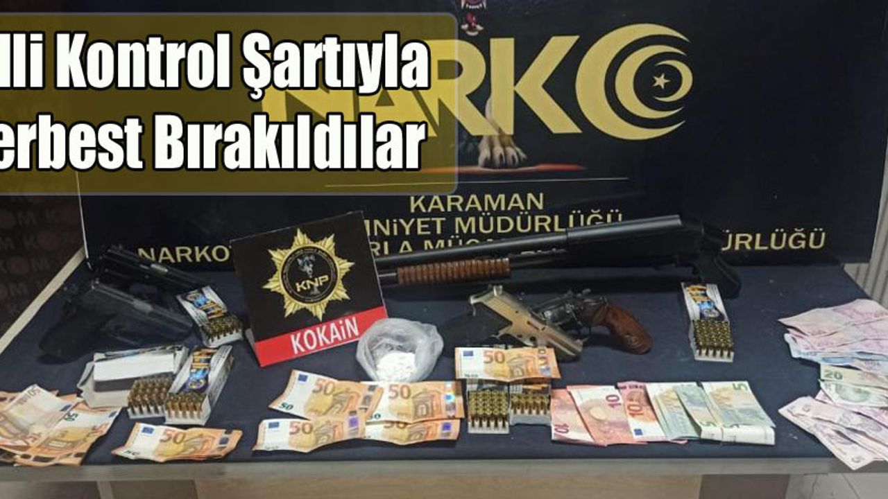 Edinilen bilgiye göre Karaman İl Emniyet Müdürlüğü Narkotik Suçlarla Mücadele Şube Müdürlüğü ekipleri aldıkları duyum üzerine takibe aldıkları A.T. ve V.D. isimli şahısları düzenledikleri operasyonla yakalayarak gözaltına aldı. Ekiplerin yaptığı aramalarda ise 30 gram kokain, 4 adet tabanca, 1 adet av tüfeği, 235 adet tabanca mermisi, 955 Euro ve 940 Türk Lirası ele geçirildi. Emniyetteki işlemlerin tamamlanmasının ardından adliyeye sevk edilen şahıslardan A.T., savcılık ifadesinin ardından, V.D. ise adli kontrol şartıyla serbest bırakıldı.