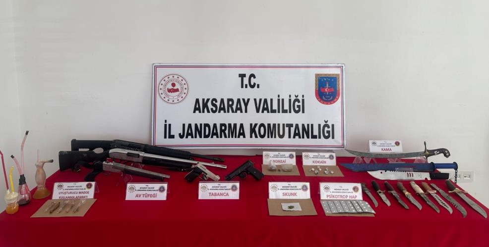 Şahısları takibe alan jandarma ekipleri 6 gün yapılan teknik ve fiziksel takibin ardından operasyon için düğmeye bastı. 2 ayrı adrese eş zamanlı olarak gerçekleştirilen operasyonda elma ağacı altında gömülü 3 adet ruhsatsız av tüfeği, 65 gram sentetik cannabinoid bonzai, 12 gram eroin, 10 gram kokain, 15 gram metamfetamin, 2 gram skunk, 66 adet psikotrop hap, 6 adet uyuşturucu veya uyarıcı madde kullanma aparatı, baza altında 2 adet ruhsatsız tabanca, 2 adet av tüfeği şarjörü, 2 adet tabanca şarjörü, 27 adet tabanca fişeği, 19 adet av tüfeği fişeği, 2 adet kılıç, 2 adet pala, 9 adet kama ve 5 bin 820 TL suçtan elde edildiği değerlendirilen para ele geçirildi.