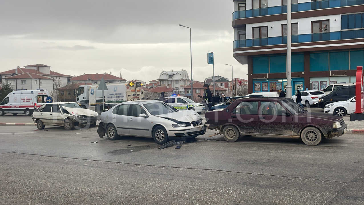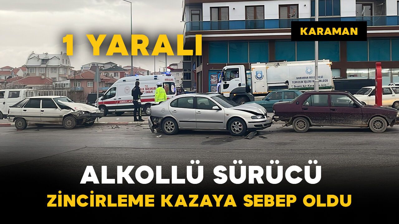 Kaza, saat 18.00 sıralarında Osmangazi Mahallesi Alparslan Türkeş Bulvarı üzerinde meydana geldi. Edinilen bilgiye göre, Z.M.C. yönetimindeki 70 A*N 2*9 plakalı otomobil sürücüsünün direksiyon hakimiyetini kaybetmesi sonucu kontrolden çıkarak, trafik ışıklarında beklemekte olan A.K. idaresindeki 42 B*R 1*6 plakalı Seat marka otomobile arkadan çarptı. Çarpmanın etkisiyle 42 B*R 1*6 plakalı otomobil de önünde duran 70 A*F 6*6 plakalı Tofaş marka otomobile çarptı. Kazada 42 B*R 1*6 plakalı otomobilin sürücüsü A.K. yaralandı. İhbar üzerine olay yerine sağlık ve polis ekipleri sevk edildi. Yaralı sürücü, ambulansla Karaman Eğitim ve Araştırma Hastanesi’ne kaldırılarak tedavi altına alındı. Polis ekiplerince yapılan kontrolde, kazaya sebebiyet veren sürücü Z.M.C.’nin 1.02 promil alkollü olduğu tespit edildi. Alkollü sürücüye 25 bin lira para cezası kesilirken, ehliyetine ise 6 ay süreyle el konuldu. Sürücü daha sonra ekip aracıyla ifadesi alınmak üzere emniyete götürüldü.