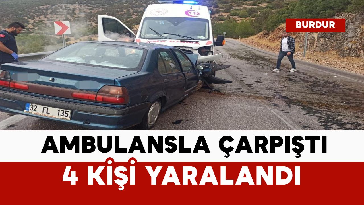 Kaza, saat 18.30 sıralarında Çeltikçi ilçesi Peçenek mevkiinde meydana geldi. Edinilen bilgiye göre, A.A. (37) idaresindeki 32 FL 135 plakalı otomobil ile O.B.Ö. (32) idaresindeki 15 SK 986 plakalı ambulans kafa kafaya çarpıştı. Kazada her iki araç sürücü ve ambulansta bulunan sağlık görevlileri M.G. (39) ile Ş.T. (32) yaralandı. Kaza ihbarı üzerine adrese sağlık ve jandarma ekipleri sevk edildi. Yaralılar, sağlık ekipleri tarafından yapılan ilk müdahalenin ardından ambulanslarla hastaneye kaldırıldı.