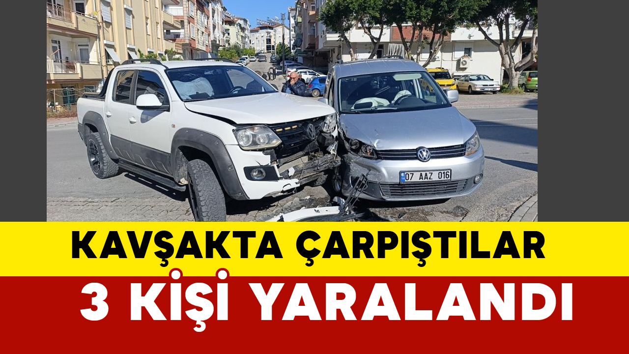 Manavgat ilçesi Kasaplar Mahallesi’nde 8522 Sokak üzerinde meydana gelen kazada, Mehmet Ö. F. idaresindeki 07 ANR 695 plakalı kamyonet ile Kasaplar Camii önünden 8528 Sokak yönüne dönmek isteyen Elif A. yönetimindeki 07 AAZ 016 plakalı otomobil kontrolsüz kavşakta çarpıştı. Kazada otomobil sürücüsü Elif A. ile yolcu olarak bulunan Zehra A. ve Gülşen A. yaralandı. Yaralılar, olay yerine sevk edilen 112 sağlık ekiplerince yapılan ilk müdahalenin ardından ambulansla hastaneye kaldırıldı. Yaralıların hayati tehlikesinin bulunmadığı öğrenildi.