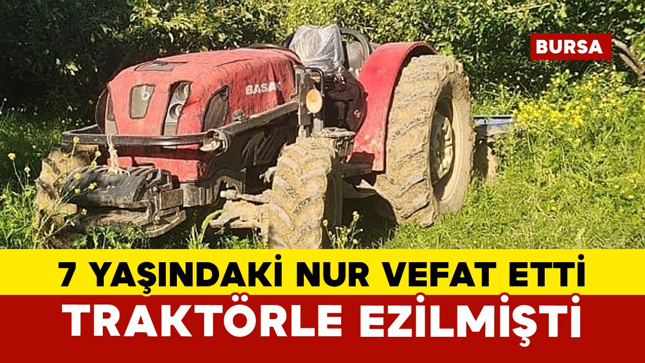 Mehmet B. tarlasını sürdüğü sırada, geri manevra yapınca tarlada gezinen 7 yaşındaki kızı Nur'u fark etmeyerek üzerinden geçti. Başının üzerinden lastiğin geçtiği çocuk ağır yaralandı. Kızını ezen baba, şok geçirdi. Ağır yaralanan 7 yaşındaki Nur Bayrak, olay yerine sevk edilen ambulansla İnegöl Devlet Hastanesine kaldırıldı.