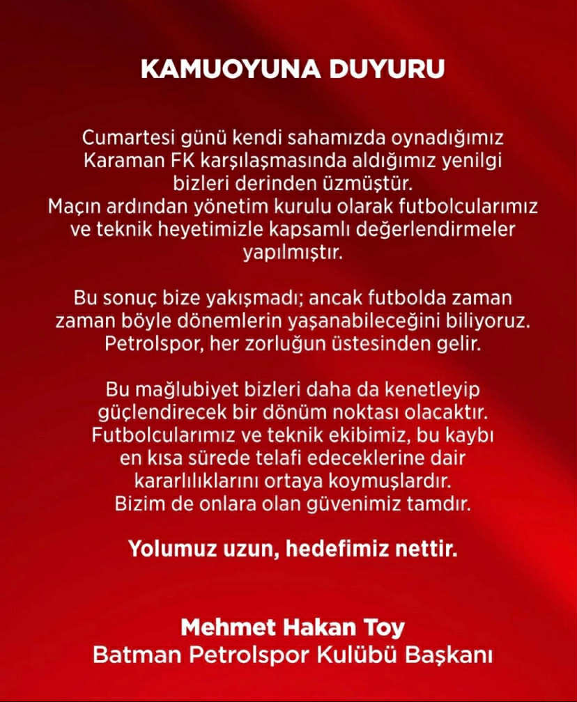 Mağlubiyetin ardından Batman Petrolspor Kulüp Başkanı Mehmet Hakan Toy, yazılı bir açıklama yaparak sonuçtan duydukları üzüntüyü dile getirdi. Toy açıklamasında şu ifadelere yer verdi: