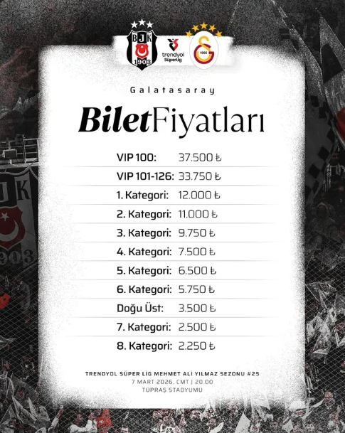 Siyah-beyazlı kulüp tarafından yapılan açıklamaya göre, biletler kategoriye göre farklı fiyatlandırıldı. VIP tribünlerinde fiyatlar 33.750 TL ile 37.500 TL arasında değişirken, diğer tribünlerde fiyatlar 2.250 TL’den başlayarak 12.000 TL’ye kadar yükseliyor. İşte detaylar: