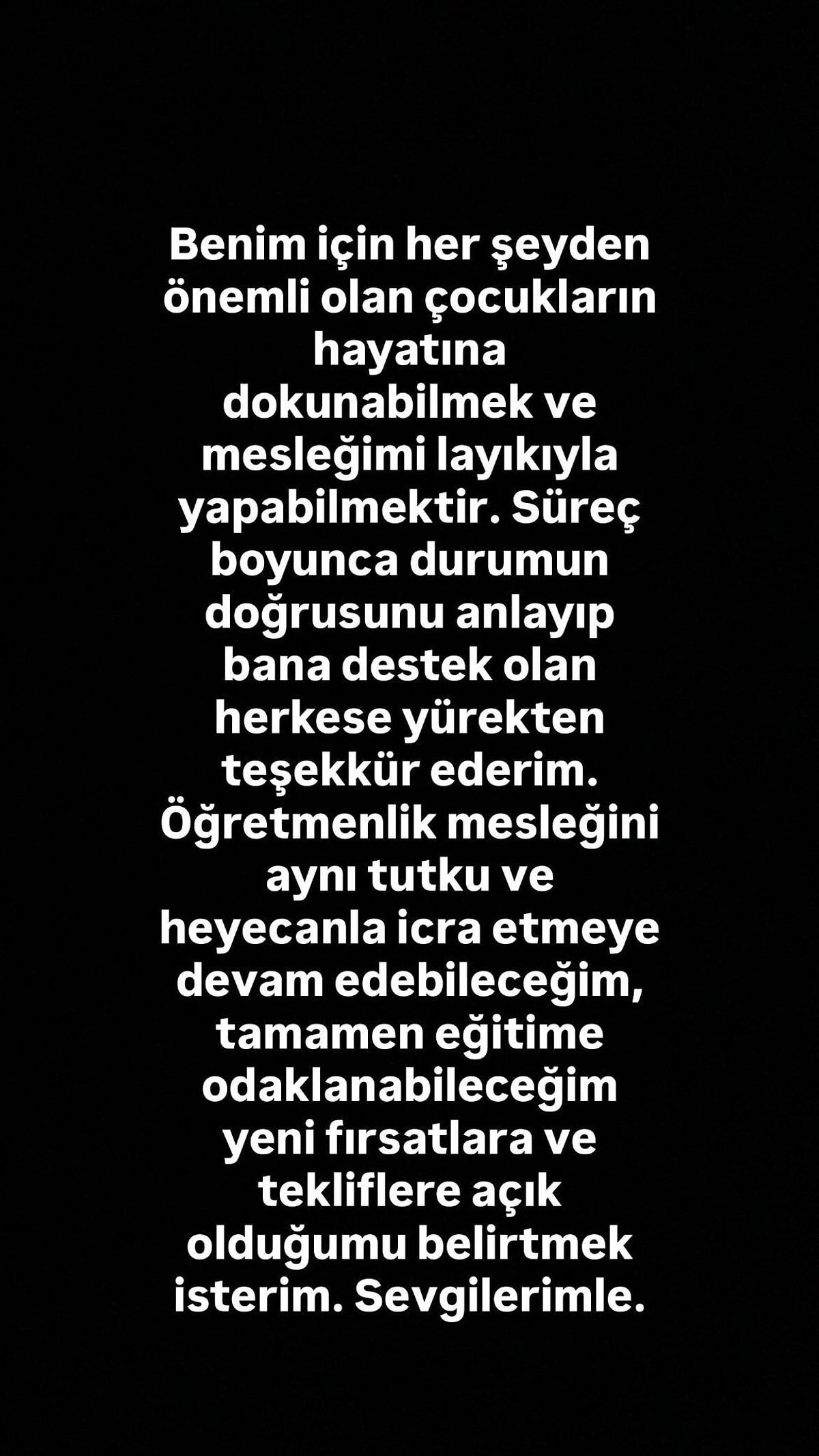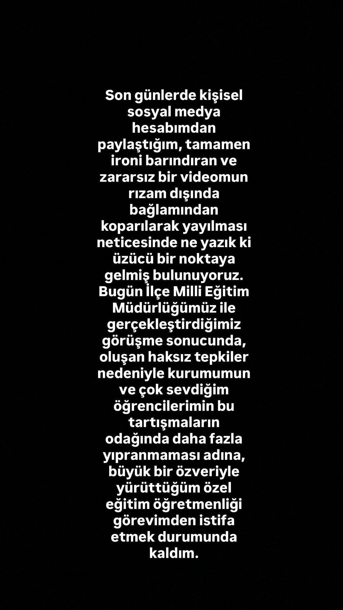 Yaptığı açıklamada sürecin kendisi açısından üzücü bir noktaya ulaştığını dile getiren genç eğitimci, paylaşımının amacının yanlış anlaşıldığını vurguladı. Görüntülerin izinsiz şekilde farklı mecralarda yayılmasının mağduriyet oluşturduğunu belirten öğretmen, öğrencilerinin ve kurumunun daha fazla etkilenmemesi için istifa kararı aldığını ifade etti.