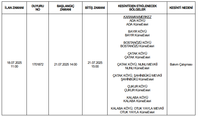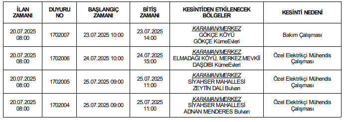 MERAM Elektrik Dağıtım A.Ş. Karaman 1 İşletme sorumluluk alanında bulunan Karaman'da planlı elektrik kesintisi yapacak.