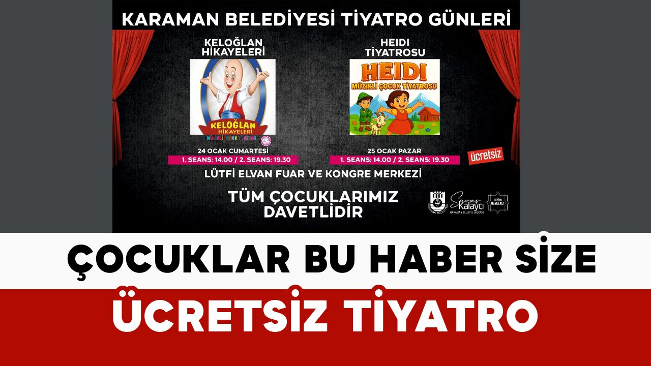 Karaman Belediyesi, yarıyıl tatilinde öğrenciler için etkinlikler düzenliyor. Çocukların keyifle izleyeceği iki farklı oyununun sergileneceği tiyatro etkinliği, Lütfi Elvan Fuar ve Kongre Merkezi’nde sahnelenecek. 24 ve 25 Ocak tarihlerinde her gün iki seans olarak düzenlenen tiyatroya tüm çocuklar ve aileleri davet edilirken, oyunlar ve seanslar şu şekilde olacak: 24 Ocak 2026 Cumartesi günü Keloğlan Hikâyeleri isimli oyun 14.00 ve 19.30 saatlerinde, 25 Ocak 2025 Pazar günü Heidi Müzikli Çocuk Tiyatrosu isimli oyun da yine 14.00 ve 19.30 saatlerinde gösterilecek.