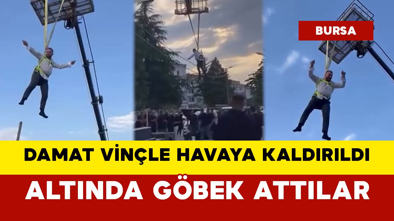 Düğün evine giriş yapmadan önce damada yapılan bu sıra dışı uygulama görenleri hem şaşırttı hem güldürdü. Vinçle yukarı çekilen damadın hemen altında arkadaşları müzik eşliğinde göbek atarak çiftetelli oynadı. Zaman zaman damadın ayaklarına uzanıp tutmaya çalışan arkadaşlarının eğlenceli anları cep telefonu kameralarıyla saniye saniye kaydedildi.