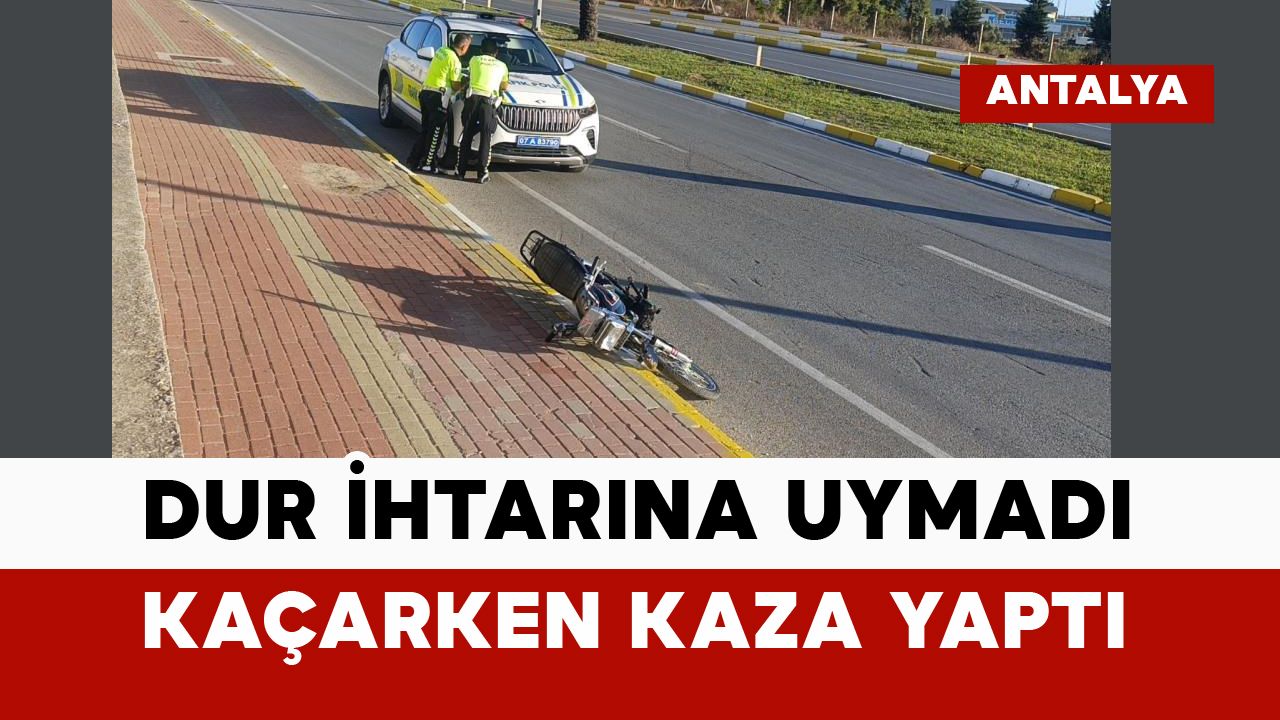 Manavgat İlçe Emniyet Müdürlüğü Trafik Denetleme Büro Amirliği ekipleri, Antalya-Manavgat girişi Çakal Deresi mevkiinde uygulama yaptığı sırada, karşı şeritten Antalya istikametine seyir halindeki plakasız motosikletin sürücüsü trafik polislerinin gözleri önünde motosikletin önünü kaldırdıktan sonra hızla uzaklaştı. Trafik polislerinin ‘dur’ ihtarına uymayarak uzaklaşan motosiklet sürücüsü yaklaşık 200 metre ileride devrilerek sürüklendi. Kazanın ardından motosiklet sürücüsü ve motosikletteki yolcu olarak bulunan arkadaşı yaralanmalarına rağmen hızla uzaklaşarak gözden kayboldu.