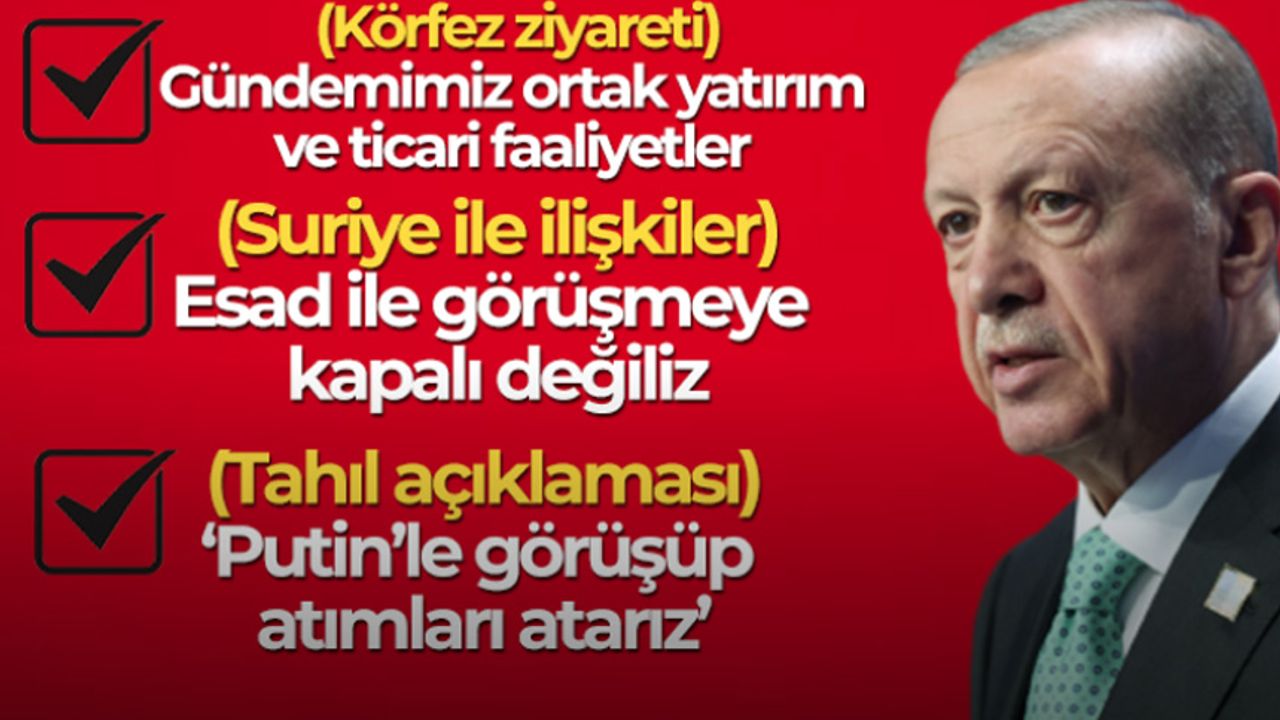 Ziyaretinin bir sonraki durağı olan Katar’da ikili ilişkiler ve bölgesel meseleler konusunda fikir alışverişinde bulunacaklarını söyleyen Erdoğan, "Körfez turumuzun son durağı Birleşik Arap Emirlikleri olacak. Birleşik Arap Emirlikleri, Körfez bölgesinde ticaretimizin son dönemde en yüksek seyrettiği ülkedir. Bu rakamı iki ülkenin gerçek potansiyeline yaraşır bir seviyeye çıkarmak istiyoruz. Bu ziyaretlerimizde ayrıca Türkiye'nin gurur kaynağı olan Togg'un muhataplarımıza hediye olarak verilmesi teşkil edilecek. Temaslarımız ardından Kıbrıs Barış Harekatı'nın yıldönümü münasebetiyle düzenlenecek törenlere katılmak üzere Lefkoşa'ya geçeceğiz. Cumhurbaşkanı sayın Ersin Tatar ile bir araya gelerek Ercan Havalimanı’nın yeni terminal ve pistinin açılışını gerçekleştireceğiz" açıklamalarında bulundu.
