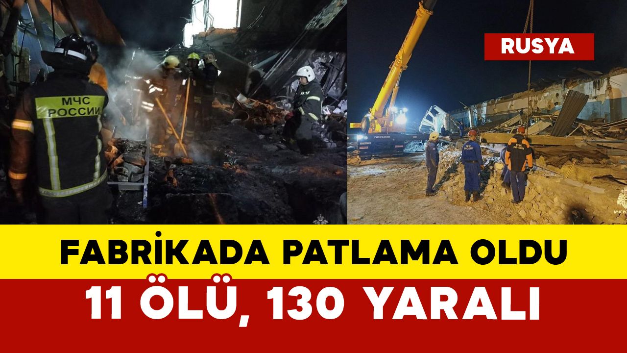 Rusya'nın Ryazan bölgesindeki bir fabrikada cuma akşamı yangın sonrası patlama meydana geldi. Bölgeye çok sayıda kurtarma ve sağlık ekibi sevk edildi. Rusya Acil Durumlar Bakanlığından yapılan açıklamada, patlamada 11 kişinin hayatını kaybettiği, 130 kişinin de yaralandığı belirtildi. Fabrikada ne üretildiği bilinmezken, bazı Rus medya kuruluşları, patlamanın barutun alev alması sonucu meydana geldiğini aktardı.