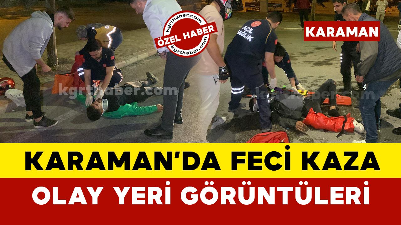 Kaza, akşam saatlerinde Hamidiye Mahallesi İbrahim Öktem Caddesi üzerinde meydana geldi. Edinilen bilgiye göre, aynı yönde seyrettikleri öğrenilen İ.T.K. idaresindeki 70 ACC 151 plakalı motosiklet ile İ.Ö. yönetimindeki 70 AB 587 plakalı motosiklet çarpıştı. Çarpışmanın etkisiyle İ.T.K. idaresindeki 70 ACC 151 plakalı motosiklet orta refüje çarparak karşı şeride fırladı. Kazada motosikletlerden savrulan 2 sürücü yaralandı. Çevredekilerin ihbarı üzerine olay yerine sağlık itfaiye ve polis ekibi sevk edildi. Kazayı duyarak olay yerine gelen yaralıların yakınları gözyaşı döktü. Kazada yaralanan motosiklet sürücüleri olay yeri müdahalesi sonrası ambulanslarla Karaman Eğitim ve Araştırma Hastanesi’ne kaldırıldı. İtfaiye ekibi benzin sızıntısı olan motosikletin çevresinde güvenlik önlemi alarak motosiklete müdahale etti. Kazaya karışan motosikletler çekici ile yoldan kaldırılırken kazayla ilgili tahkikat başlatıldı.