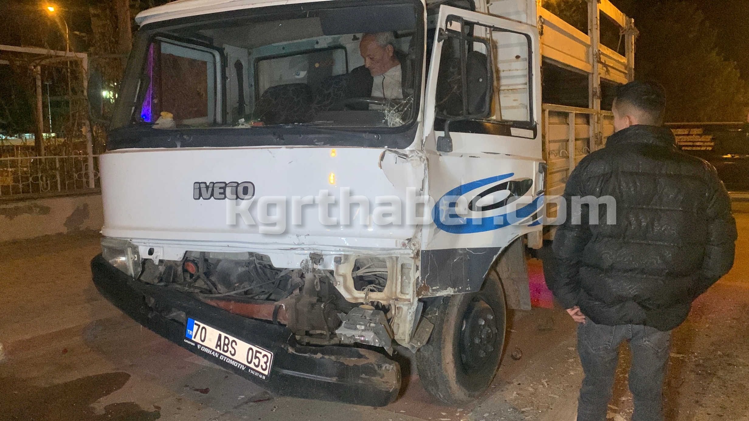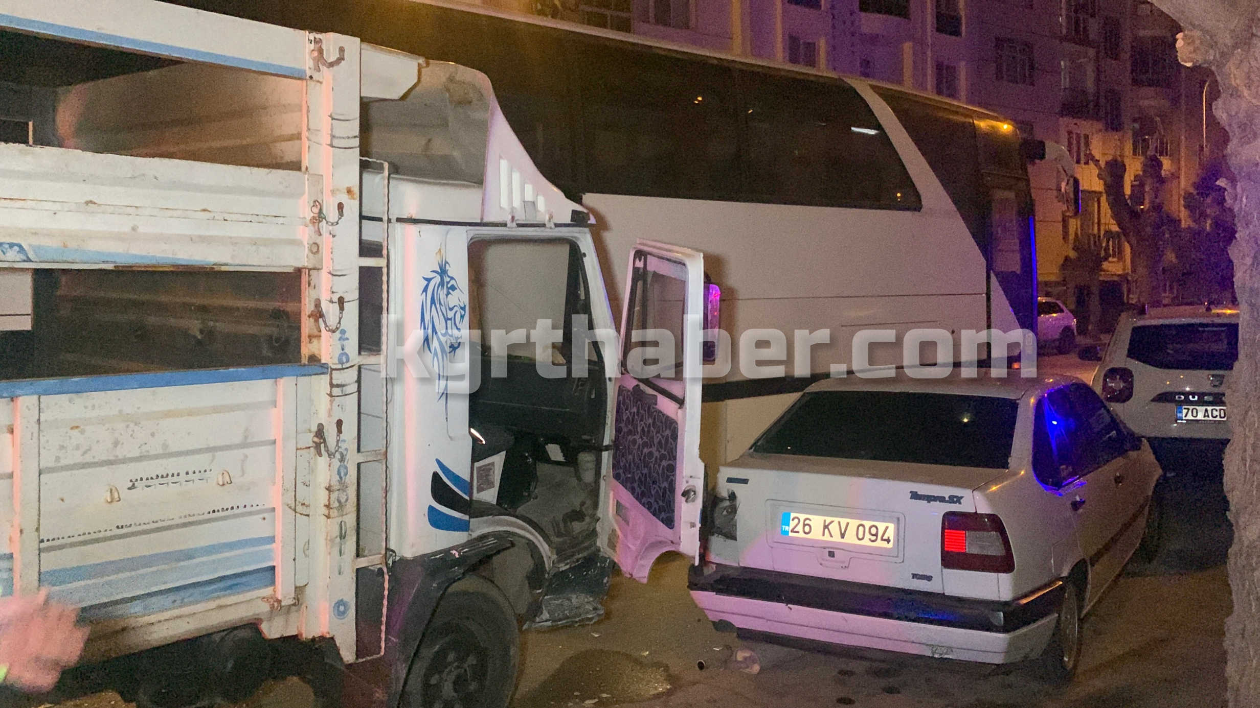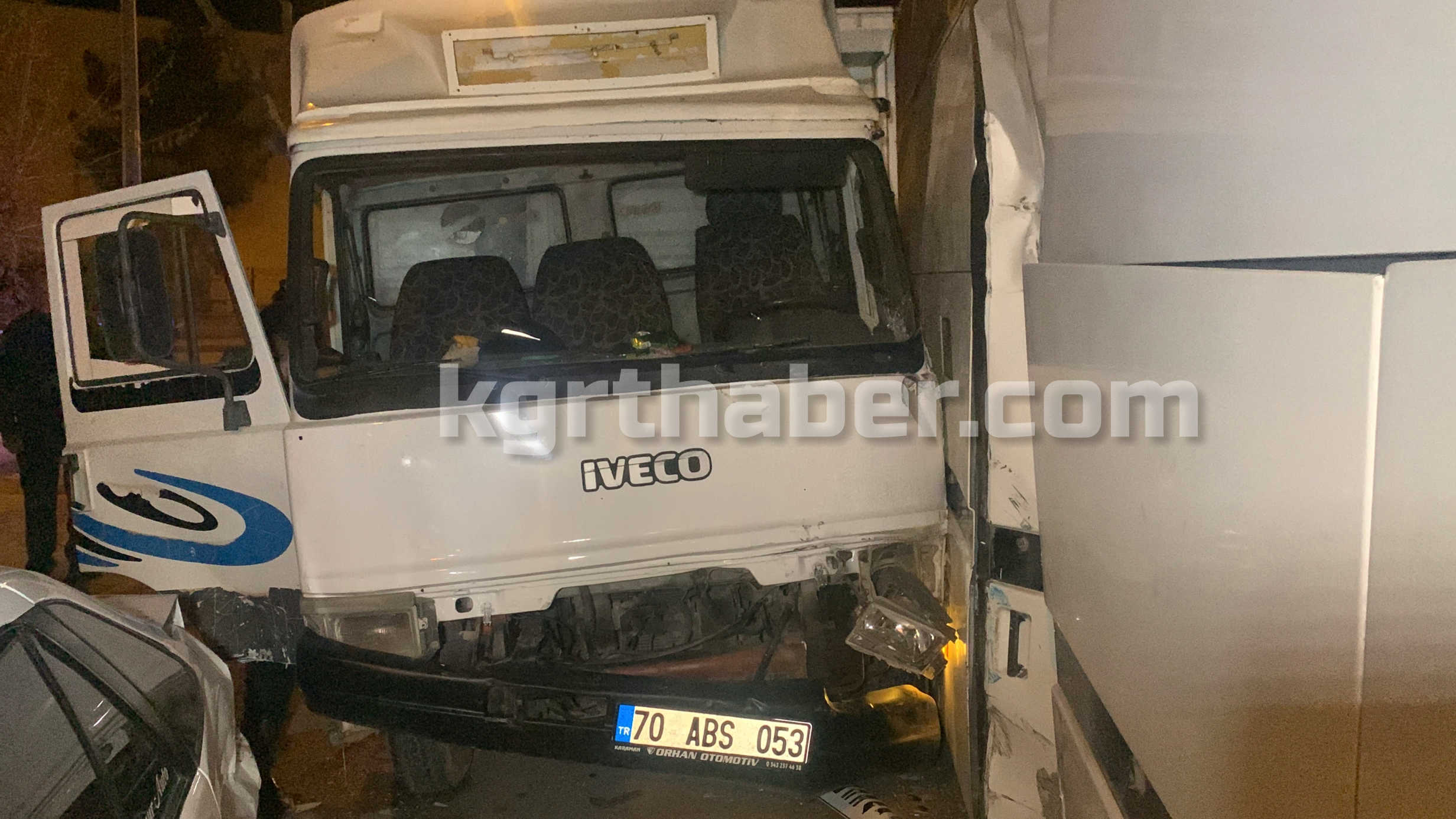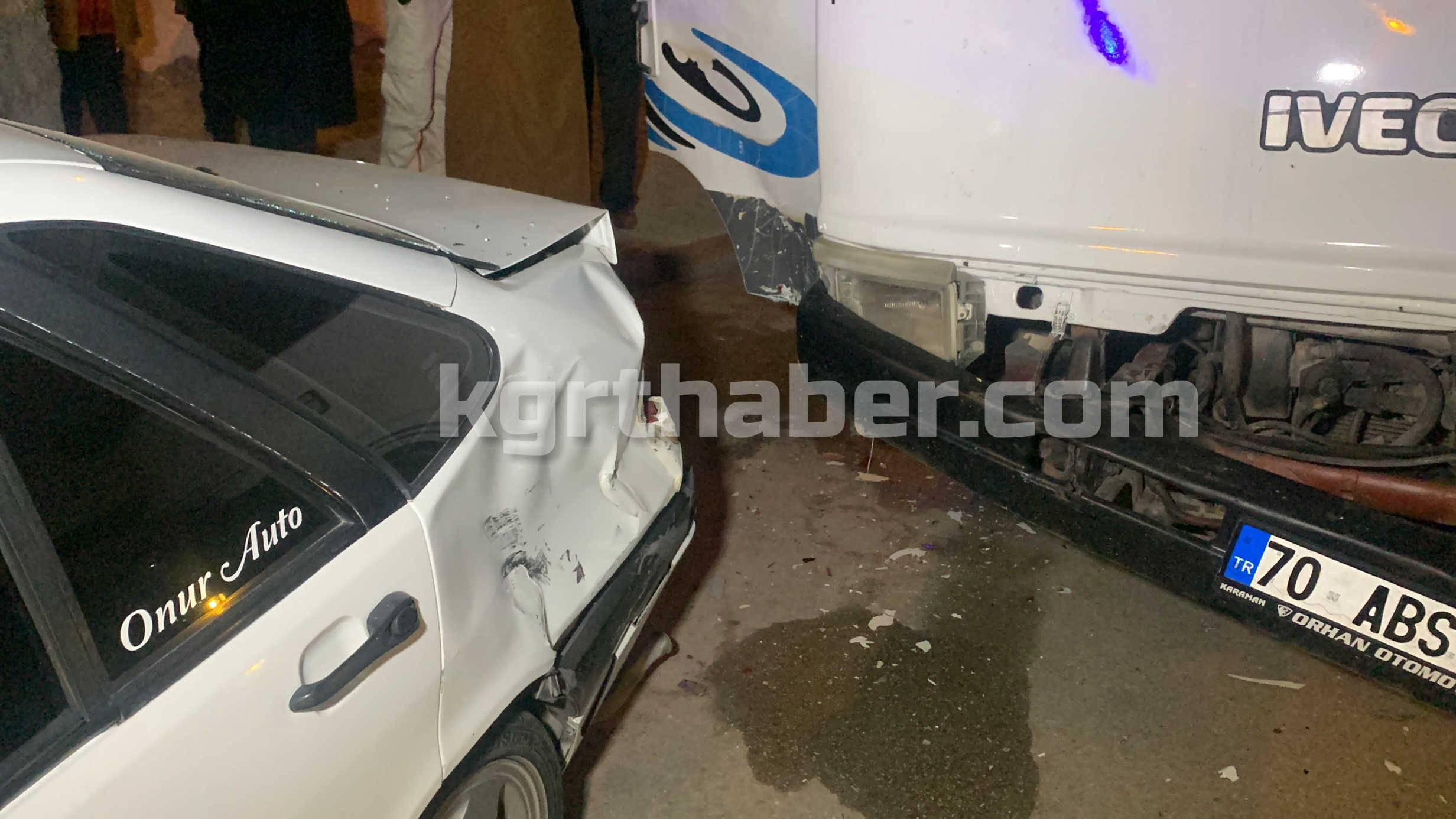 Kaza, akşam saatlerinde Nefise Sultan Mahallesi Doktor Sadık Ahmet Caddesiüzerindeki kavşakta meydana geldi. Edinilen bilgiye göre, İ.A. idaresindeki 70 ABS 053 plakalı kamyon kontrolden çıkarak T.A. idaresindeki 58 EU 304 plakalı otobüse çarptı. Çarpışmanın etkisiyle savrulan kamyon park halindeki 2 otomobile çarparak durabildi. Kazada kamyon sürücüsü T.A. ve park halindeki 26 KV 094 plakalı otomobildeki 11 yaşındaki M.A. yaralandı. İhbar üzerine olay yerine sağlık, itfaiye ve polis ekibi sevk edildi. Kazada yaralananlar ambulansla Karaman Eğitim ve Araştırma Hastanesi’ne kaldırılarak tedavi altına alındı. Kazaya karışan otobüs sürücüsü T.A., “Kamyon ana yoldan geldi ve durmadan otobüse çarptı, sonra da park halindeki 2 araca çarptı” diyerek kaza anını anlattı. Kazaya karışan kamyon çekici ile yolan kaldırılırken kazayla ilgili tahkikat başlatıldı.