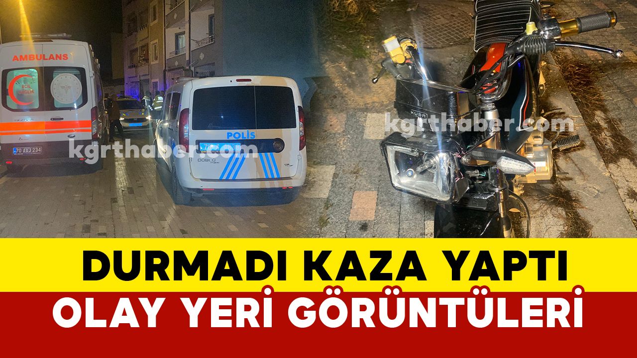 Olay, gece saatlerinde Abbas Mahallesi Hoca Mahmut Caddesi üzerinde yaşandı. Edinilen bilgiye göre, polisin dur ihtarına uymayan M.E. idaresindeki 70 ABT 119 plakalı motosiklet trafik polisinin dur ihtarına uymayarak kaçmaya başladı. 5 dakikalık kovalamaca sonrasında direksiyon hakimiyetini kaybeden motosiklet sürücüsü M.E. kaldırımdaki elektrikli bisiklete çarparak kaza yaptı. İhbar üzerine olay yerine sağlık ekibi sevk edildi. Kazada yaralanan motosiklet sürücüsü ambulansla Karaman Eğitim ve Araştırma Hastanesi’ne kaldırılarak tedavi altına alındı. Polisten kaçan motosiklet sürücüsünün ehliyetine el koyulurken, sürücüye çeşitli maddelerden 15 bin lira ceza yazıldı. Öte yandan kasksız motosiklet kullanan M.E.’nin aday sürücü olduğu ve ceza puanının 55 olduğu ortaya çıktı. Kazaya karışan motosiklet çekici ile yoldan kaldırılırken olayla ilgili tahkikat başlatıldı.