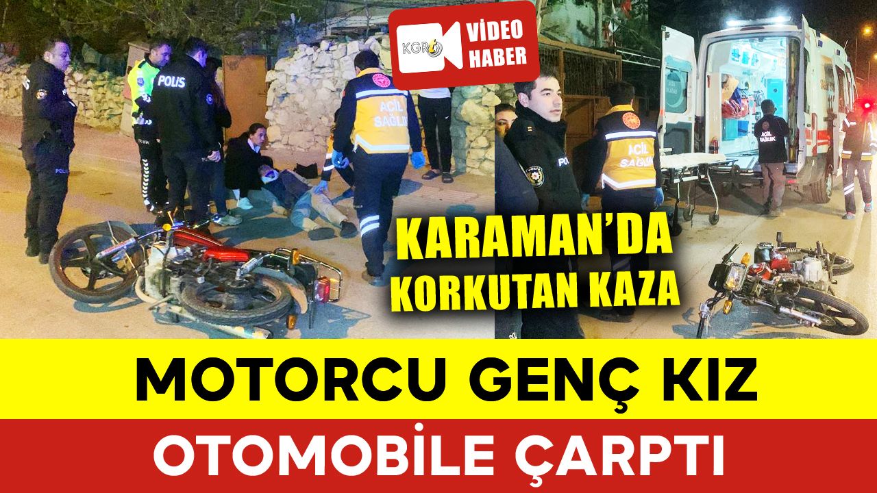 Karaman’da akşam saat 21.15 sıralarında Zembilli Ali Efendi Mahallesi’nde meydana gelen kazada edinilen bilgiye göre, dönüş yapmakta olan Ü.Ş. idaresindeki 45 ST 964 plakalı Ford marka otomobile A.A.D. yönetimindeki 33 ALB 655 plakalı motosiklet çarptı. Çarpışmanın etkisiyle motosiklet sürücüsü genç kız yere savruldu. Çevredeki vatandaşlar hemen yardıma koşarak durumu 112 Acil Çağrı Merkezi’ne bildirdi. İhbar üzerine olay yerine sağlık ve polis ekipleri sevk edildi. Kazada yaralanan motosiklet sürücüsü ambulansla Karaman Eğitim ve Araştırma Hastanesi’ne kaldırıldı. Polis kazayla ilgili inceleme başlattı.