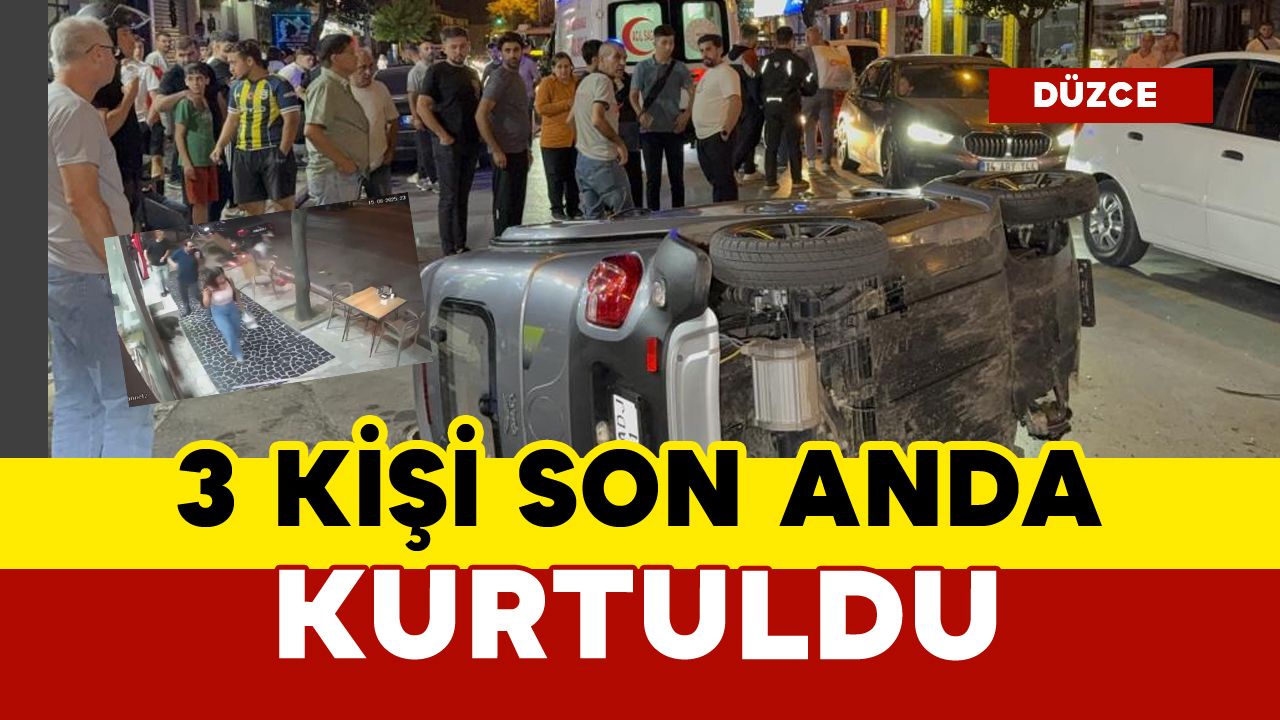Kaza Atatürk Bulvarı Gürcü Osman Cami önünde meydana geldi. Alınan bilgilere göre Çoban kavşağı istikametinden Düzce Belediyesi istikametine seyir halinde olan A.Ö. idaresindeki 81 ADJ 211 plakalı elektrikli otomobil ara sokağa girmek için sinyal verdiği esnada aynı istikamette giden Ö.D. İdaresinde ki 81 AFF 238 plakalı motosikleti ile çarpıştı. Çarpışmanın etkisi ile elektrikli otomobil devrilirken, motosiklet savrulup park halindeki 2 araca çarparak durabildi. Kaza da motosiklet üzerinde ki 2 kişi ile elektrikli otomobil içindeki sürücü yaralandı. Yaralılar ambulanslarla hastaneye kaldırılırken, kaza sebebi ile kapanan yol araçların kaldırılmasının ardından normal seyrine döndü. Kaza ile ilgili inceleme başlatıldı.