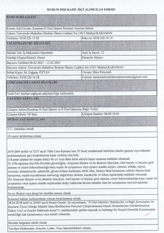 06 Şubat 2025 Perşembe günü başlayan başvurulara ait detayların 5 gün süreyle İŞ-KUR sayfasında yer alan "KURUM DIŞI KAMU İŞÇİ ALIMI İLANI" sekmesinde yer aldığı görülürken başvuruya ilişkin evraklar Karaman İl Özel İdaresi bünyesinde bulunan İnsan Kaynakları Ofisi karşısında yer alan Personel A.Ş. biriminde görevli M. Çağatay Öztan isimli personele verilecek.