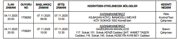 MERAM Elektrik Dağıtım A.Ş. Karaman 1 İşletme sorumluluk alanında bulunan Karaman'da planlı elektrik kesintisi yapacak.