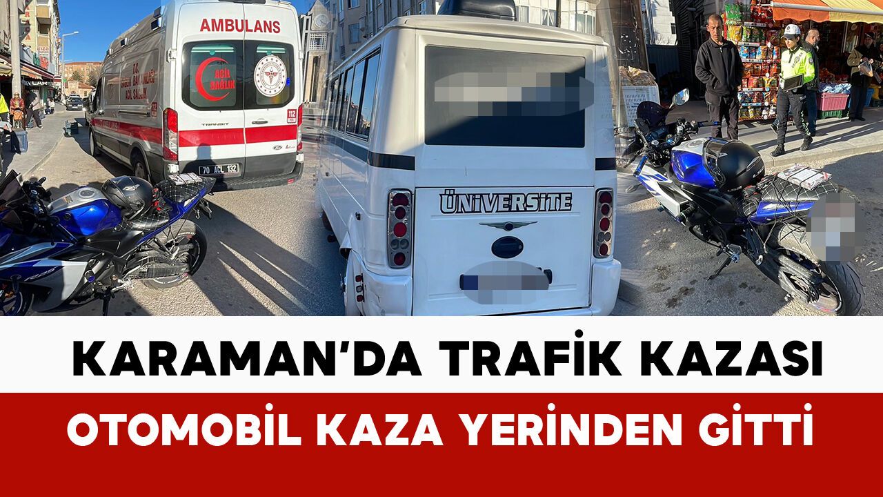 Kaza, saat 17.00 sıralarında İmaret Mahallesi Atatürk Bulvarı üzerinde meydana geldi. Edinilen bilgiye göre, sürücüsünün ismi öğrenilemeyen otomobille R.U. yönetimindeki 33 A** 3*7 plakalı motosikletle çarpıştı. Savrulan motosiklet ise S.P. idaresindeki 70 M 005* plakalı dolmuşla çarpıştı. Kazaya karışan otomobil ise olay yerinden ayrıldı. İhbar üzerine kaza yerine sağlık ve polis ekipleri sevk edildi. Kazada yaralanan olmazken araçlarda maddi hasar meydana geldi. Polis kaza yerinde yaparak, olay yerinden ayrılan sürücünün bulunması için çalışma başlattı. Kazayla ilgili tahkikat başlatıldı.