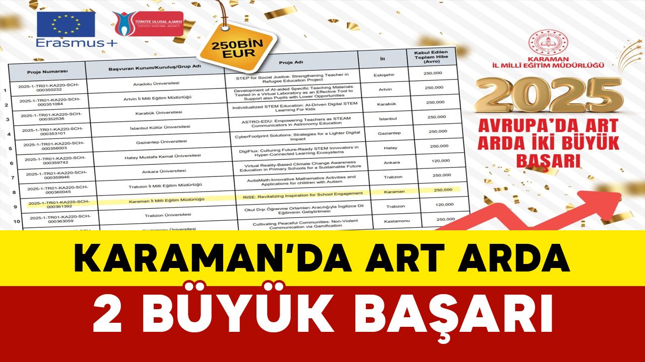 Karaman İl Millî Eğitim Müdürlüğü, bir ay içinde iki farklı Erasmus+ projesiyle Avrupa’dan toplam 500.000 Avro hibe elde ederek hem Okul Eğitimi hem de Yetişkin Eğitimi alanında güçlü bir şekilde yerini aldı.