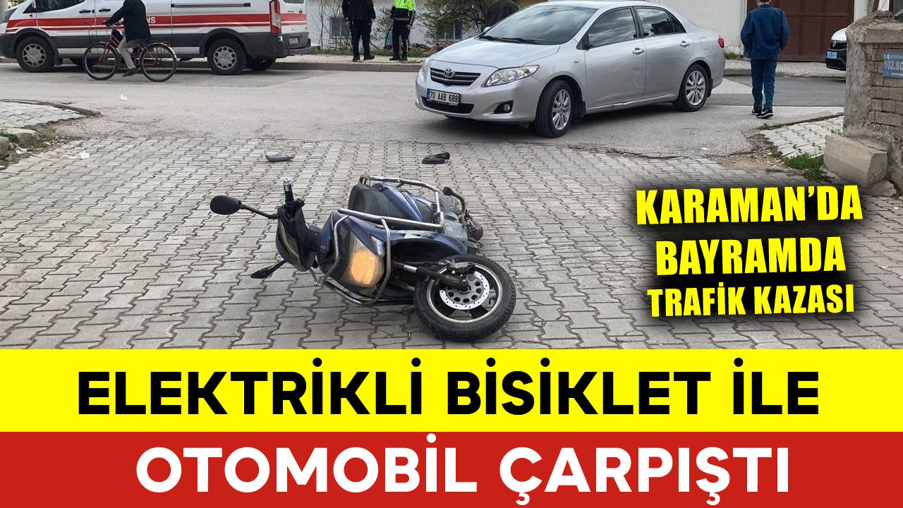 Karaman’da Gazidükkan Mahallesi’nde meydana gelen kazada edinilen bilgiye göre, sürücüsünün ismi öğrenilemeyen elektrikli bisiklet ile Ö.D. idaresindeki 70 AAB 688 plakalı otomobil Şehit Ahmet Taşer Caddesi’nde çarpıştı. İhbar üzerine olay yerine sağlık ve polis ekipleri sevk edildi. Kazada yaralanan olmazken araçta maddi hasar meydana geldi.