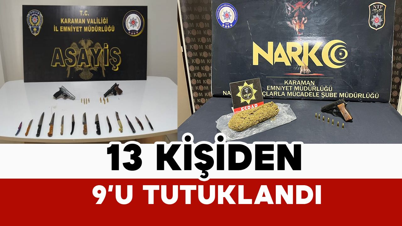 Edinilen bilgiye göre, Karaman Cumhuriyet Başsavcılığı koordinesinde İl Emniyet Müdürlüğü ekiplerince 19-25 Ocak 2026 tarihleri arasında kent genelinde yürütülen çalışmalarda 2 bin 78 şahıs sorgulando. Çeşitli suçlardan aranan 13 şahıs yakalanırken, bu kişilerden 9’u çıkarıldıkları adli makamlarca tutuklandı.