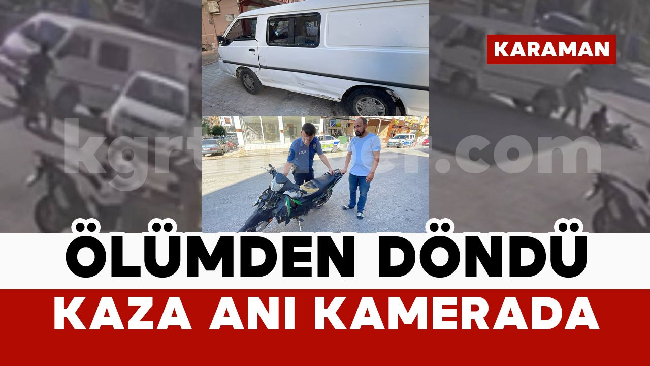 Kaza, saat 16.00 sıralarında İmaret Mahallesi Mehmet Ziya Çelebi Caddesi üzerinde meydana geldi. Edinilen bilgiye göre, A.S. idaresindeki 70 A*N 6*5 plakalı panelvan araç ile A.E.K. (19) yönetimindeki elektrikli bisiklet sürücüsü çarpıştı. Çarpışmanın etkisiyle yere savrulan genç panelvan aracın altında kalmaktan son anda kurtuldu. Çevredekilerin ihbarı üzerine olay yerine sağlık ve polis ekipleri sevk edildi. Yaralı genç, ambulansla Karaman Eğitim ve Araştırma Hastanesi’ne kaldırılarak tedavi altına alındı. Bir iş yerinin güvenlik kamerasına yansıyan görüntülerde elektrikli bisikletle tepsideki çayları götüren elektrikli bisiklet sürücüsünün direksiyon hakimiyetini kaybetmesi sonrası savrularak panelvan araca çarptığı ve sürücüsünün panelvan aracın altında kalmaktan son anda kurtulduğu anlar görülüyor.