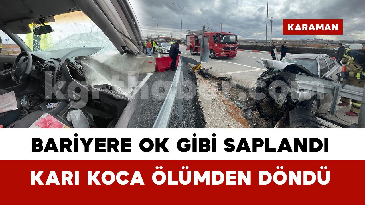 Kaza, sabah saat 10.20 sıralarında Bahçelievler Mahallesi Recep Tayyip Erdoğan Bulvarı üzerinde meydana geldi. Edinilen bilgiye göre, Yunus E. (26) yönetimindeki 06 A* 55*4 plakalı Hyundai marka otomobil, sürücüsünün direksiyon hakimiyetini kaybetmesi sonucu kontrolden çıkarak yol kenarındaki demir bariyerlere saplandı. Kazayı gören diğer sürücülerin ihbarı üzerine olay yerine sağlık ve polis ekipleri sevk edildi. Kazada sürücü Yunus E. ile yanında yolcu olarak bulunan eşi Remziye E. (23) yaralandı. Yaralı çift, olay yerinde yapılan ilk müdahalelerinin ardından ambulanslarla Karaman Eğitim ve Araştırma Hastanesi’ne kaldırılarak tedavi altına alındı. Aracın LPG’li olması nedeniyle adrese çağrılan itfaiye ekipleri adreste geniş güvenlik önlemleri aldı. Ekipler, LPG’li araçta önlem alırken, araca saplanan demir bariyerleri kesti. İncelemelerin ardından otomobil, çekici vasıtasıyla otoparka götürüldü.