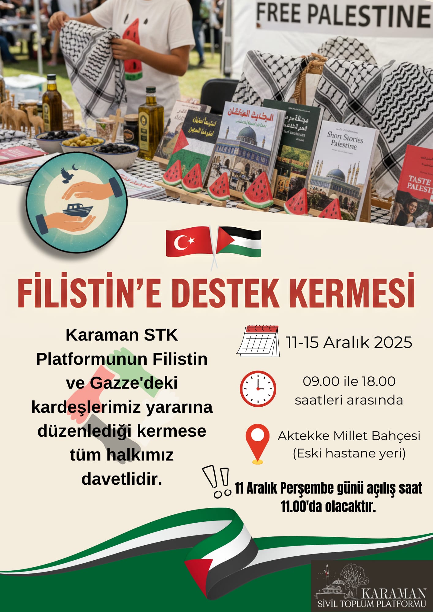 Karaman STK Platformu tarafından Filistin ve Gazze’deki ihtiyaç sahibi ailelere destek amacıyla kermes düzenlenecek. Etkinliğe tüm Karaman halkının davetli olduğu belirtildi.