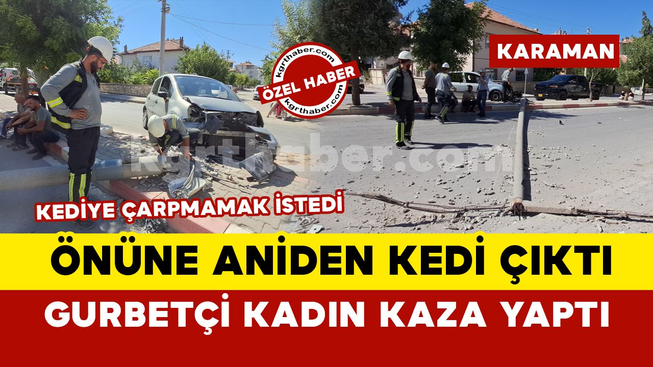 Kaza, sabah saatlerinde Karamanoğlu Mehmet Bey Mahallesi Kenzi Caddesi üzerinde meydana geldi. İddiaya göre, Hollanda’dan memleketi Karaman’da gelen S.E. isimli kadın, 48 A* 4*4 plakalı otomobiliyle seyir halindeyken bir anda önüne kedi çıktı. Kediye çarpmamak için manevra yapınca otomobilin kontrolünü kaybetti. Kontrolden çıkan otomobil orta refüjü aşarak aydınlatma direğine çarptı. Çarpmanın etkisiyle aydınlatma direği karşı şerit üzerine devrilerek yol trafiğe kapandı.