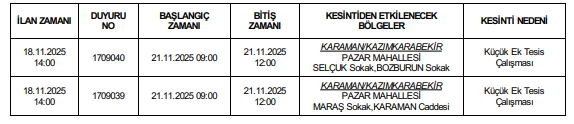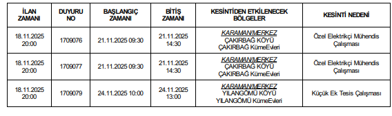 MERAM Elektrik Dağıtım A.Ş. Karaman 1 İşletme sorumluluk alanında bulunan Karaman'da planlı elektrik kesintisi yapacak.