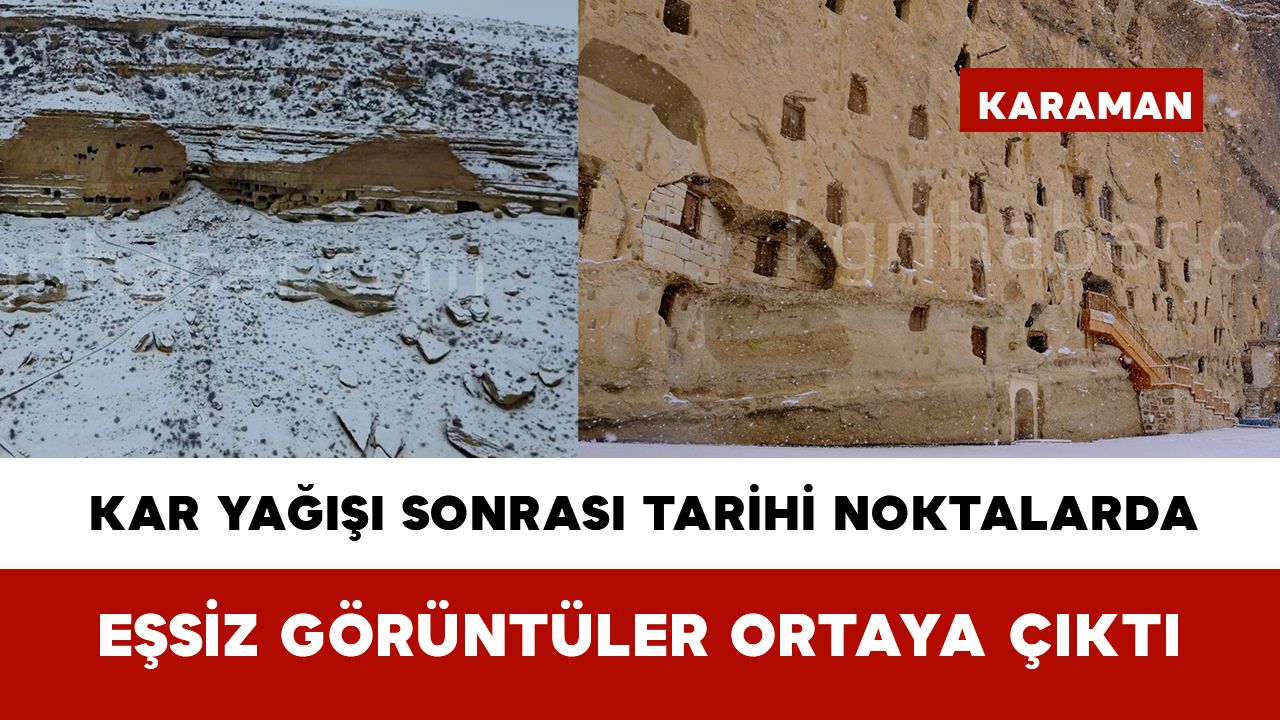 Karaman merkeze bağlı Taşkale Köyü’nde bulunan Taşkale Tahıl Ambarları ile Yeşildere Köyü’ndeki Manazan Mağaraları, kar yağışının ardından beyaz örtüyle kaplandı. Tarihi yapılar üzerinde oluşan manzaralar görenleri mest ederken, ortaya çıkan kartpostallık görüntüler havadan dron ile görüntülendi.