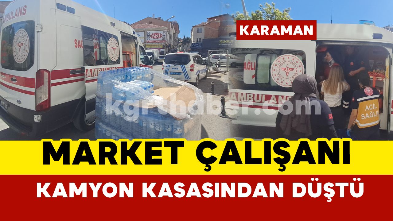Olay, sabah saatlerinde Tahsin Ünal Mahallesi Tabakhane Geçidi Caddesi üzerindeki bir marketin önünde yaşandı. Edinilen bilgiye göre, market çalışanı olduğu öğrenilen R.K.(40) marketin önünde kamyonun kasasında yük indirdiği esnada dengesini kaybederek yaklaşık 1.5 metre yükseklikten yere düştü. Durumun fark edilmesi üzerine ihbar üzerine olay yerine sağlık ve polis ekipleri sevk edildi. Yaralı kadın çalışan ambulansla Karaman Eğitim ve Araştırma Hastanesi’ne kaldırılarak tedavi altına alındı. Olayla ilgili tahkikat başlatıldı.
