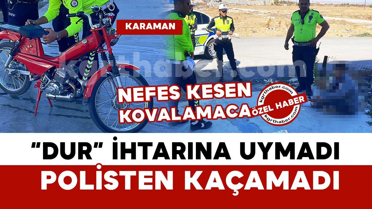 Polisle yaşanan nefes kesen kovalamacada ayağı takılarak yere düşen genç ayağından yaralanınca polis ekiplerince yakalandı. Yakalanan şahıs adrese çağrılan sağlık ekibinin ilk müdahalesinin ardından ambulansla Karaman Eğitim ve Araştırma Hastanesi’ne kaldırılarak tedavi altına alındı. Aday sürücü olduğu öğrenilen M.K.’ye çeşitli maddelerden 56 bin lira ceza yazılırken, ceza puanını doldurduğu için ehliyeti iptal edildi. Trafikten men edilen plakasız mobilet ise çekiciyle otoparka götürüldü. Olayla ilgili tahkikat başlatıldı.