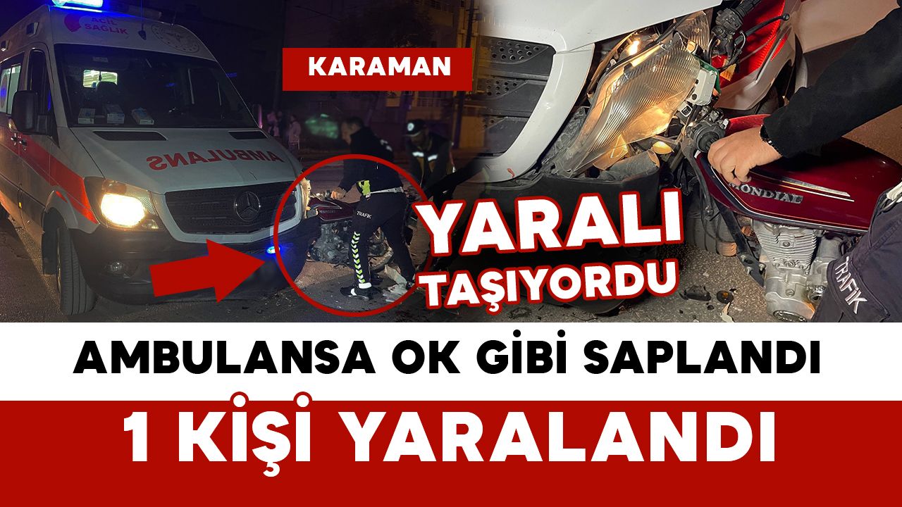 Kaza, akşam saat 19.00 sıralarında İmaret Mahallesi Behçet Kemal Çağlar Caddesi üzerindeki kavşakta meydana geldi. Edinilen bilgiye göre, A.T. idaresindeki 70 E* 1*2 plakalı ambulansla U.P. yönetimindeki 70 A* 7*8 plakalı motosiklet kavşakta çarpıştı. Çarpışmanın etkisiyle savrulan motosiklet sürücüsü yaralanırken, motosiklet ise ambulansa ok gibi saplandı. Adrese çağrılan başka ambulanslarla yaralılar Karaman Eğitim ve Araştırma Hastanesi’ne kaldırıldı.