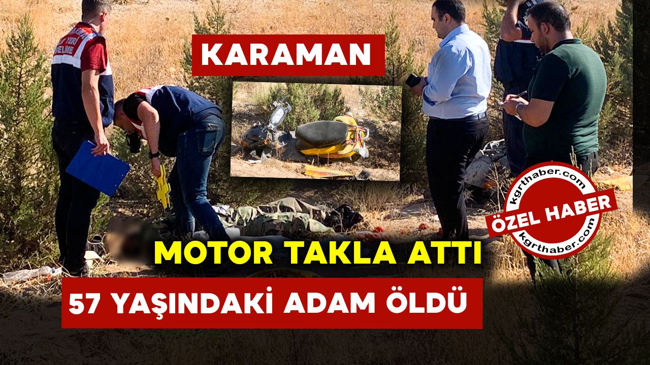 Kaza, öğle saatlerinde Ereğli-Karaman Karayolunun 50. kilometresinde meydana geldi. Edinilen bilgiye göre, Ahmet Gökbudak (57) idaresindeki 35 ECU 87 plakalı motosiklet sürücüsünün direksiyon hakimiyetini kaybetmesi sonucu kontrolden çıkarak takla attı. Kazada motosiklet sürücüsü Ahmet Gökbudak olay yerinde hayatını kaybettti. İhbar üzerine olay yerine sağlık ve polis ekibi sevk edildi. Kazada hayatını kaybeden Gökbudak’ın cansız bedeni Jandarma olay yeri inceleme ekibi ve Cumhuriyet Başsavcısı’nın olay incelemesi sonrasında Karaman Eğitim ve Araştırma Hastanesi’nin morguna kaldırıldı. Kazayla ilgili tahkikat başlatıldı.