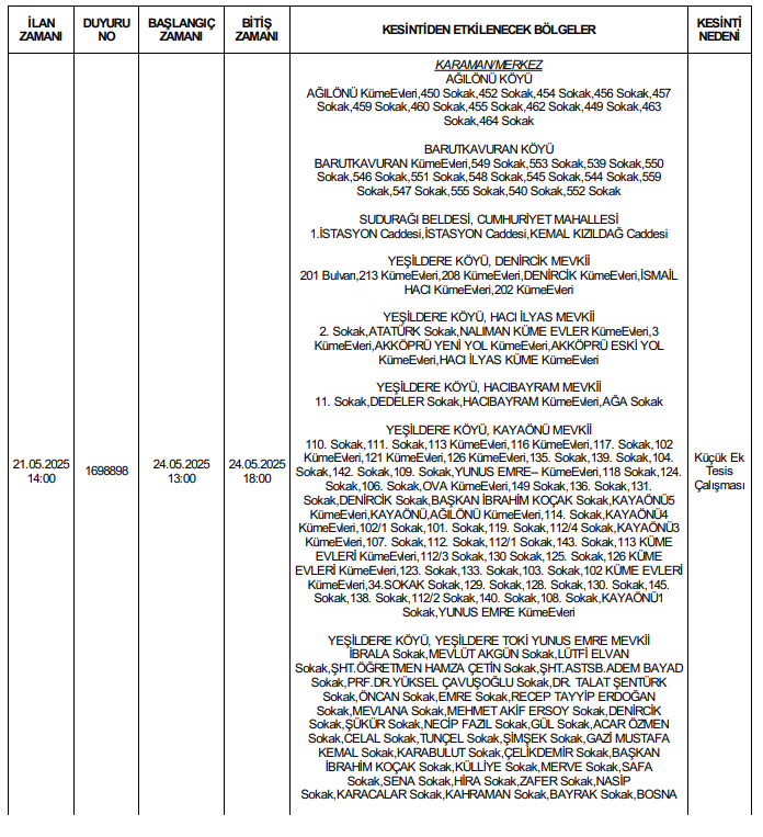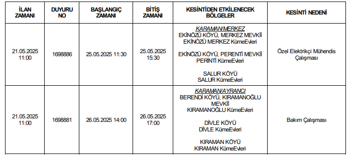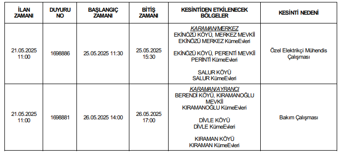 3. Jeneratör kulanan müşterilerimizin ve Elektrik Dağıtım şebekesi aracılığı ile satış yapan Elektrik enerjisi üreticilerinin kesinti süresi boyunca İş kazalarına mahal verilmemesi adına Dağıtım Şebekesi Anahtarlama elemanlarının açık olduğunu mutlaka kontrol etmeleri hususunda uyardı.