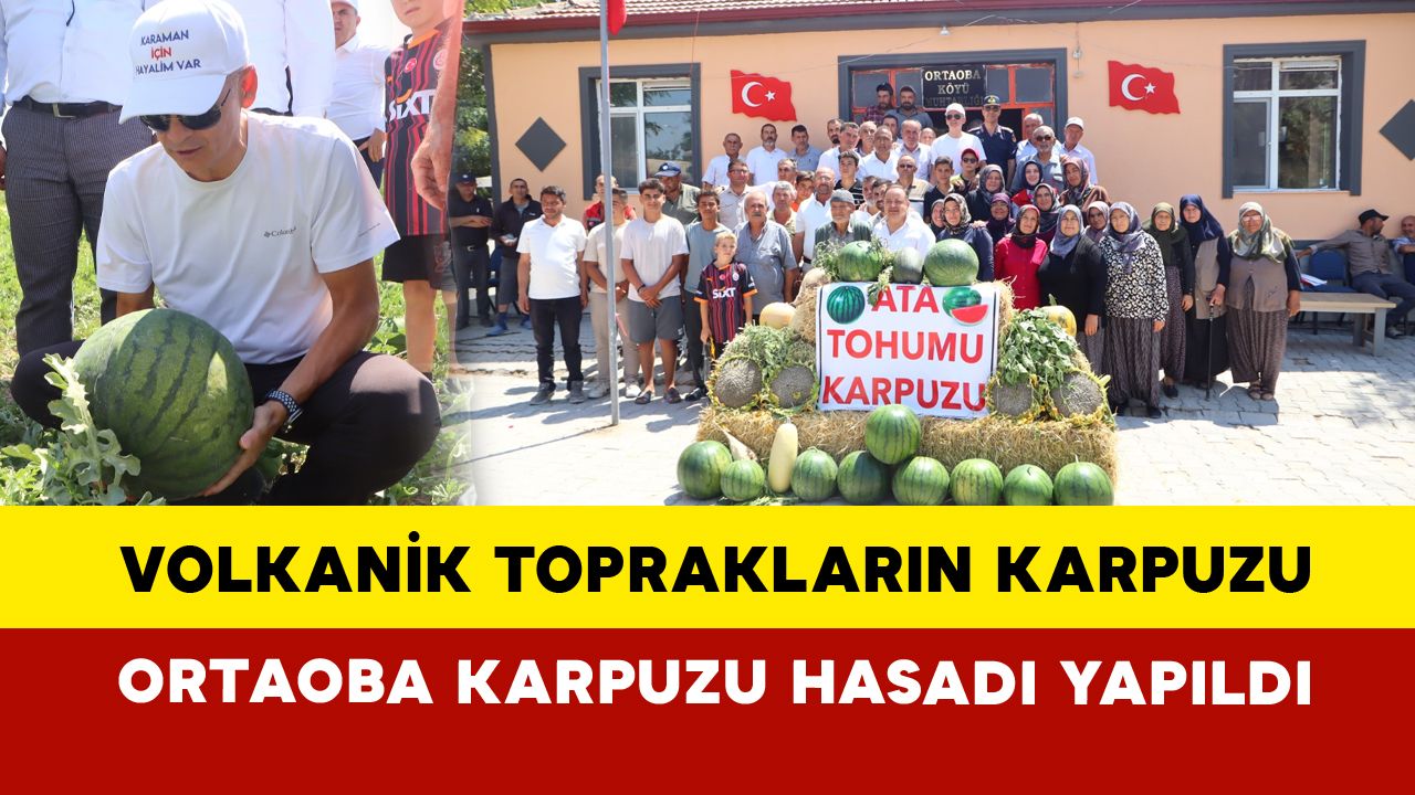 Karadağ’ın volkanik eteklerinde geleneksel ata tohumlarıyla yetiştirilen karpuz, deseni, kokusu, dayanıklılığı ve aromasının yanı sıra benzersiz tadı ile ön plana çıkıyor. Ata tohumu ile üretilen ve kumsal topraklardan aldığı minerallerle doğal ve farklı bir aroma kazanan Ortaoba Karpuzu'nun bölgenin tarımsal mirasının korunması, geliştirilmesi ve geleceğe aktarılması açısından büyük önem taşıyor. Yapılan Karpuz hasat şenliğine Karaman Valisi Mehmet Fatih Çiçekli, Karaman İl Jandarma Komutanı Osman Saygılı, İl Genel Meclisi Başkanı Tamer Yıldızbaş, İl Tarım ve Orman Müdürü Hatice Bulut, İl Özel İdaresi Genel Sekreteri Ali Yener Terlemez, AK Parti Merkez İlçe Başkanı Süleyman Kazanç, Ortaoba Köy Muhtarı Mehmet Kılınç ve Ortaoba köy halkı katıldı.
