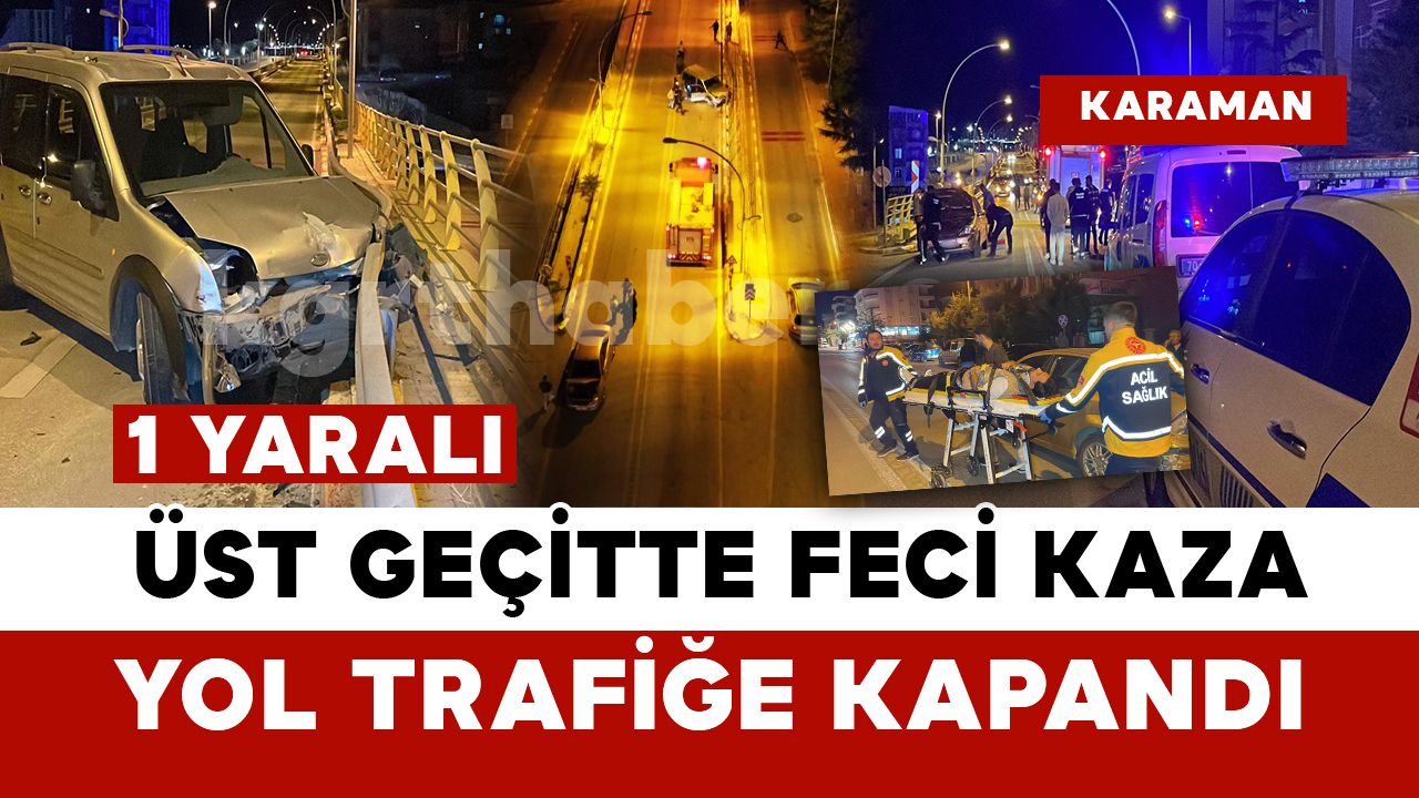 Kaza, gece saatlerinde Tabduk Emre Mahallesi Şehit Hakan Yılmaz Caddesi üzerinde bulunan üst geçitten meydana geldi. Edinilen bilgiye göre, H.S. idaresindeki 70 A*L 1*1 plakalı Ford marka otomobille sürücüsünün ismi öğrenilemeyen 42 M 36*5 plakalı Ford marka hafif ticari araç üst geçitte çarpıştı. Çarpışmanın etkisiyle savrulan hafif ticari araç bariyerlere çarparken sürücüsü kaza yerinden kaçtı. Kazaya karışan otomobilin sürücüsü H.S. ise yaralandı. İhbar üzerine adrese sağlık, itfaiye ve polis ekipleri sevk edildi. Kaza sebebiyle polis ekipleri üst geçidi trafiğe kapattı. Kazada yaralanan sürücü ambulansla Karaman Eğitim ve Araştırma Hastanesi’ne kaldırılarak tedavi altına alındı. Kazaya karışan araçların çekiciyle yoldan kaldırılması sonrası üst geçit yeniden ulaşıma açıldı. Kazayla ilgili tahkikat başlatıldı.