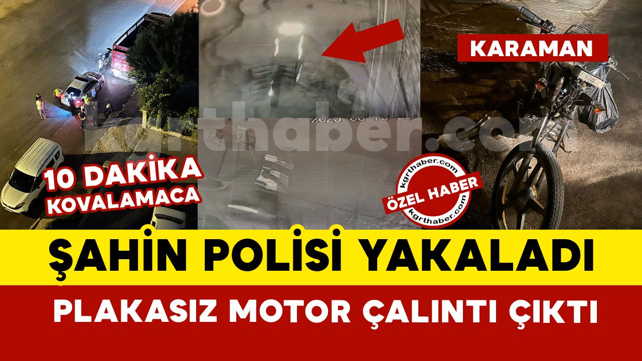 Olay, akşam saatlerinde Gevher Hatun Mahallesi’nde meydana geldi. Edinilen bilgiye göre, Doğukışla mevkiinde başlayan kovalamacada plakasız motosiklet sürücüsü R.E., polisin dur ihtarına uymayarak kaçmaya başladı. Sakarya Caddesi üzerinde devam eden kovalamacada, şüpheli motosikleti bırakarak yaya olarak kaçmaya çalıştı. Şahin polisleri tarafından kovalamaca sonunda Vali Ali Akan İlkokulu civarındaki parkta şahin polisi tarafından yakalanan R.E.’nin ehliyetinin olmadığı, polisin dur ihtarına uymadığı ve çeşitli trafik kurallarını ihlal ettiği gerekçesiyle toplam 71 bin 489 lira idari para cezası uygulandı. Yapılan sorgulamada motosikletin, 2 gün önce Tabduk Emre Mahallesi’nde çalındığı tespit edildi. Araç sahibine teslim edilirken, şüpheli R.E. gözaltına alınarak Karaman Emniyet Müdürlüğü Hırsızlık Büro Amirliğine götürüldü. Olayla ilgili soruşturma devam ediyor.