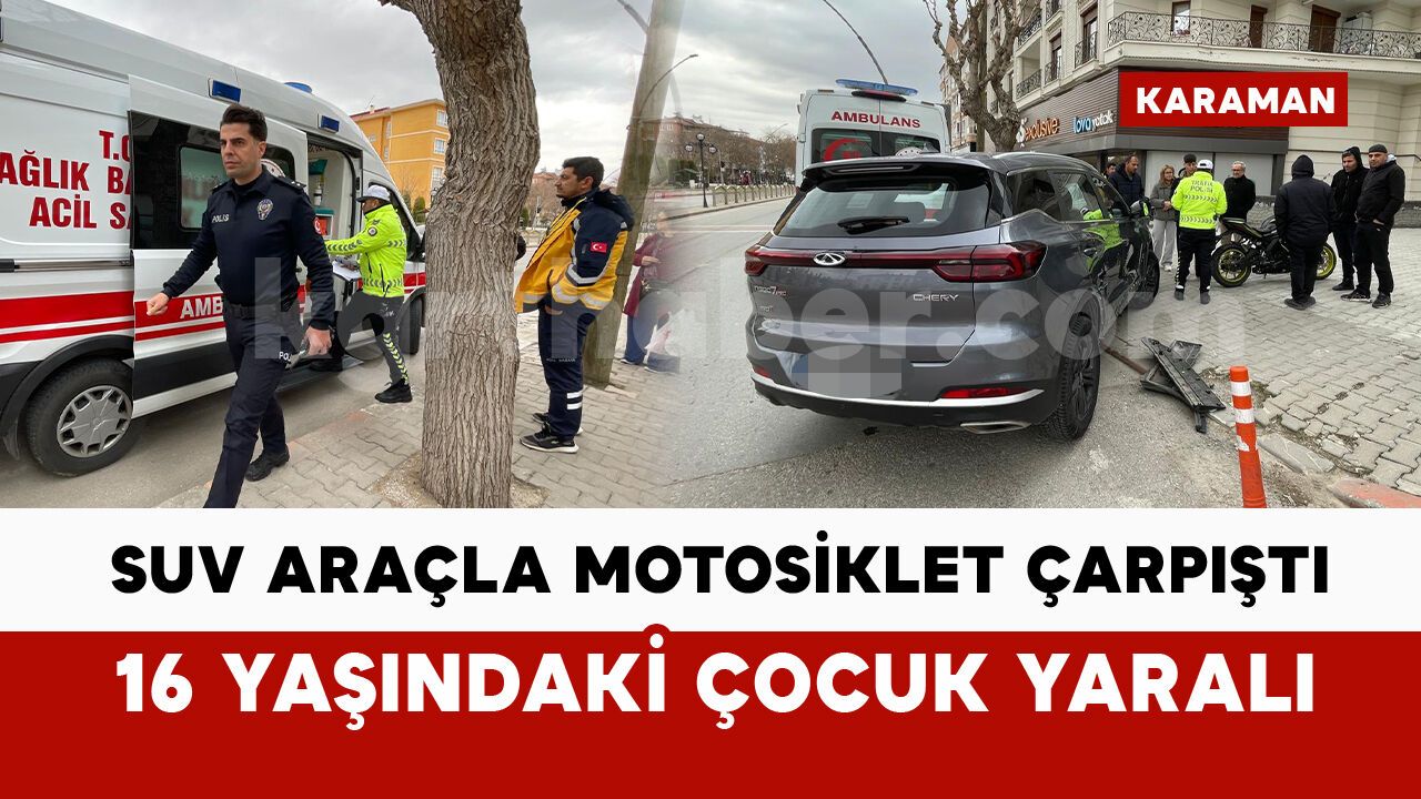 Kaza, saat 14.30 sıralarında Yeşilada Mahallesi Zeytin Dalı Bulvarı üzerinde meydana geldi. Edinilen bilgiye göre, E.D. idaresindeki 35 B*B 4*6 plakalı Chery marka SUV araç ile H.K. (16) yönetimindeki 70 A*K 7*3 plakalı motosiklet çarpıştı. Kazada devrilen motosikletin sürücüsü yaralandı. İhbar üzerine olay yerine sağlık ve polis ekipleri sevk edildi. Yaralı genç, sağlık ekiplerince olay yerinde yapılan ilk müdahalesinin ardından ambulansla Karaman Eğitim ve Araştırma Hastanesi’ne kaldırılarak tedavi altına alındı. Polis, kaza yerinde inceleme yaptı.