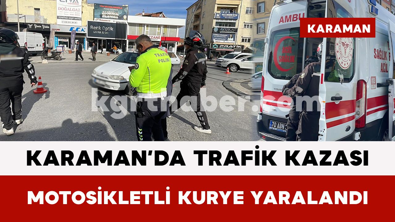Edinilen bilgilere göre, Atatürk Bulvarı üzerindeki Eski Hükümet Kavşağı’nda, 70 HX 4XX plakalı otomobilin sürücüsü bayan F.B. ile 70 AXX 6XX plakalı motosikletin sürücüsü kurye E.A. çarpıştı.