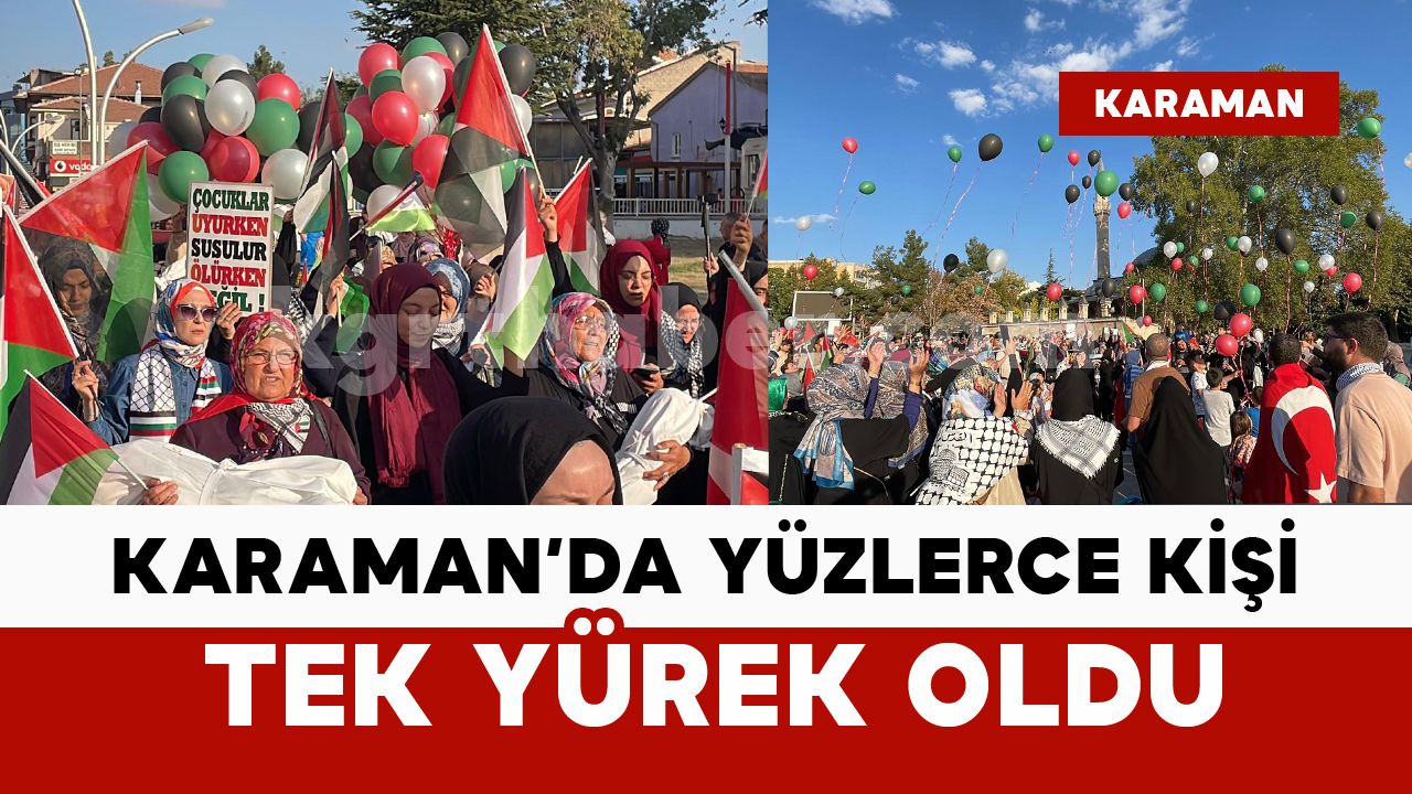 Karaman’da İsrail’in Filistin’e yönelik saldırılarını kınamak amacıyla Mutlu Yüzler Yardımlaşma ve Dayanışma Derneği tarafından bir etkinlik düzenlendi. Cumhuriyet Parkı'nda Filistin Bayrağı’nın üzerine kefenlere sarılmış oyuncak bebeklerin ve İsrail’in saldırılarında hayatını kaybeden çocukların fotoğraflarının koyulduğu bayraklı gösteri ile başlayan etkinlik yürüyüşle devam etti. Cumhuriyet Parkı önünde toplanan gencinden yaşlısına yüzlerce kişi ellerinde Türk ve Filistin bayraklarıyla Aktekke 15 Temmuz Demokrasi Meydanı’na kadar yürüdü. Yürüyüş boyunca tekbirler getiren vatandaşlar, İsrail’i sloganlar atarak protesto etti. Yürüyüşe katılan kadınlar ise ellerindeki kefenlere sarılmış oyuncak bebeklerle yürüdü. Yürüyüş boyunca ise birçok polis güvenlik amacıyla yürüyüşü takip etti.
