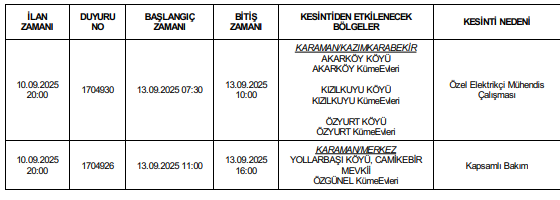 MERAM Elektrik Dağıtım A.Ş. Karaman 1 İşletme sorumluluk alanında bulunan Karaman'da planlı elektrik kesintisi yapacak.