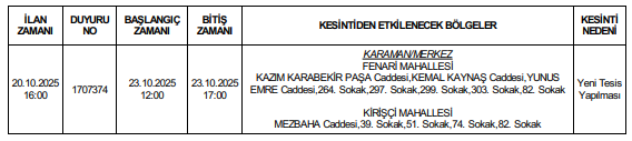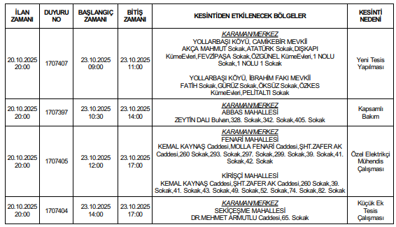 MERAM Elektrik Dağıtım A.Ş. Karaman 1 İşletme sorumluluk alanında bulunan Karaman'da planlı elektrik kesintisi yapacak.