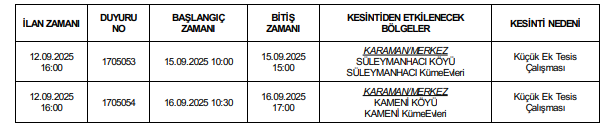 MERAM Elektrik Dağıtım A.Ş. Karaman 1 İşletme sorumluluk alanında bulunan Karaman'da planlı elektrik kesintisi yapacak.