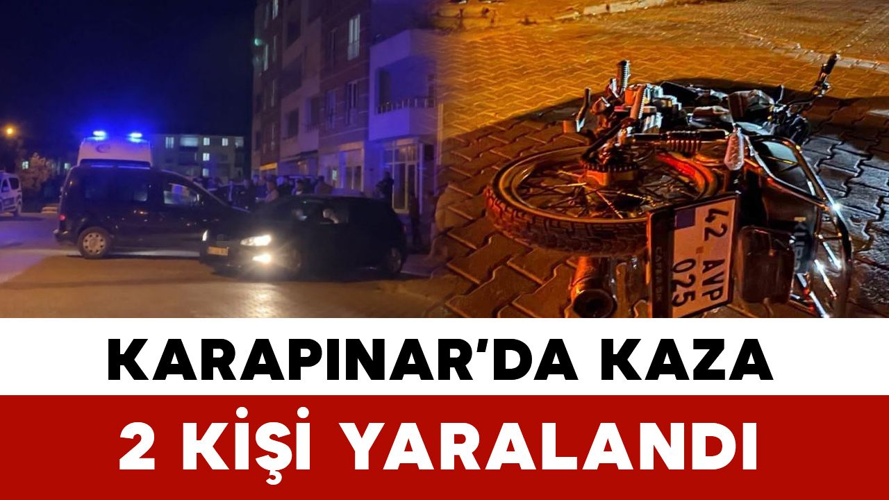 Kaza, ilçeye bağlı Sandıklı Mahallesi Fevzi Çakmak Caddesi’nde meydana geldi. Edinilen bilgiye göre, C.S.Ş. idaresindeki 42 AVP 025 plakalı motosiklet ile M.S. yönetimindeki 42 ELU 45 plakalı otomobil çarpıştı. Çarpışmanın etkisiyle motosiklet sürücüsü C.S.Ş. ve motosiklette yolcu olarak bulunan A.E.U. yaralandı. İhbar üzerine olay yerine sağlık ve polis ekipleri sevk edildi. Yaralılar, sağlık ekipleri tarafından yapılan ilk müdahalenin ardından ambulansla Karapınar Devlet Hastanesi’ne kaldırılarak tedavi altına alındı.